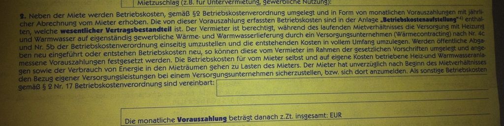 Hi … Ich wohne seit September letzten Jahres in einer Wohnung im Haus von dem Vater eines Kumpels … Besagter Kollege wohnt in der Wohnung unter mir und wir teilen uns die Miete bei seinem Vater … jetzt habe ich folgendes Problem … geeinigt haben wir uns darauf, dass ich 250 euro warm zahle … Am Sonntag hab ich n Termin beim Vermieter … Es geht wohl darum, dass die Agger Energie die Zähler abgelesen hat und jetzt 1800€ von uns, bzw von seinem Vater haben will … Ich habe bis Dato keinen Strom gezahlt und habe auch keine Aufforderung dazu erhalten … Ich ging also davon aus, dass das ganze in der Warmmiete mit drin ist … Gemeldet bin ich bei der Aggerenergie auch nicht … Allerdings habe ich theoretisch nen eigenen Zähler (dessen Zählerstand ich dummerweise nicht abgelesen habe bei Einzug - erste Wohnung und keine Ahnung -.-) … Mal abgesehen vom freundschaftlichen Aspekt würde ich gerne die rechtliche Lage wissen, wenn im Mietvertrag nichts weiter zu dem Thema vereinbart wurde … Kann er mich bzw uns zu einer Zahlung „zwingen“? Der Mietvertrag ist so ein Standart Mietvertrag, der die Vorgabe wie folgt unter „Miete und Nebenkosten“ stehen hat: