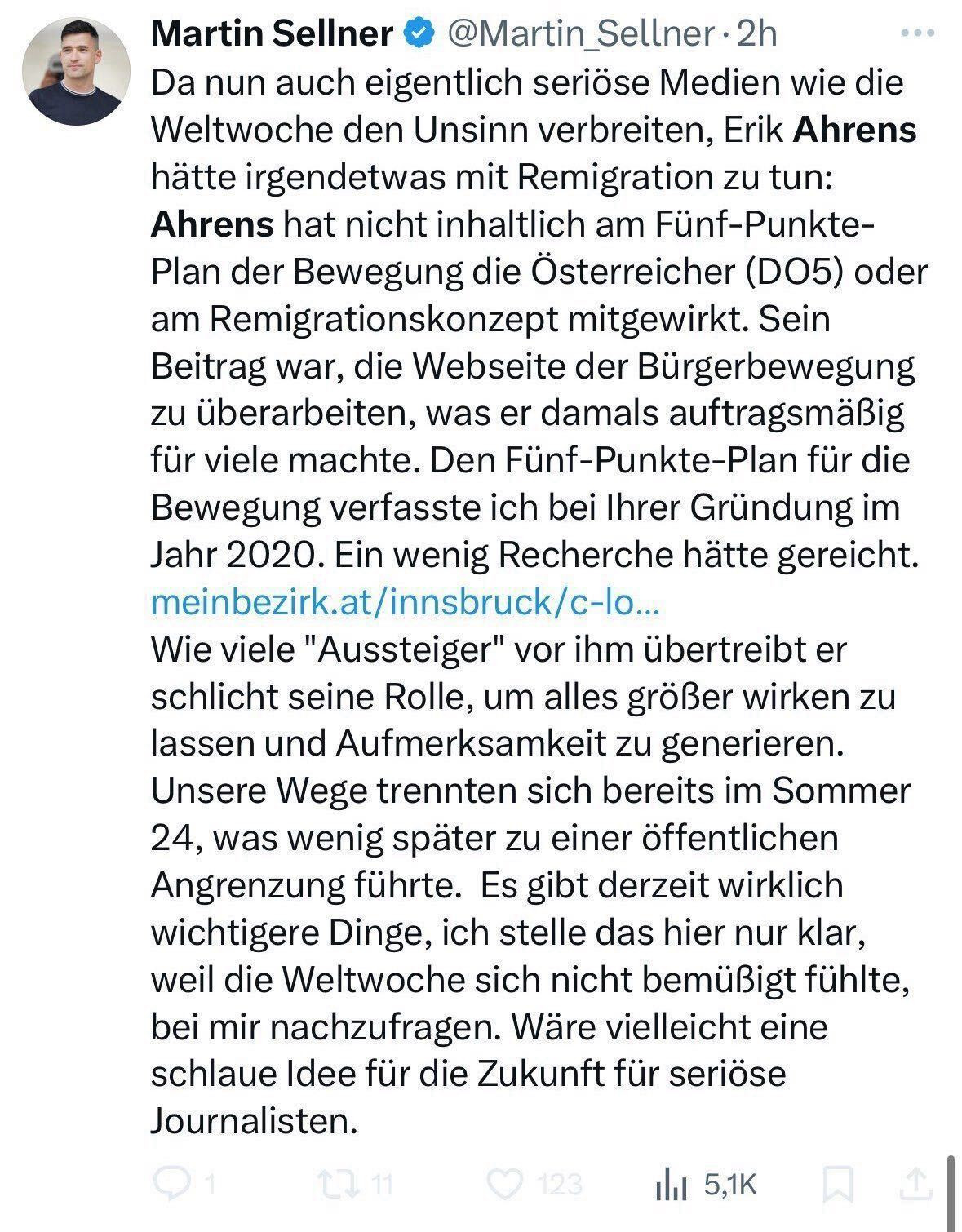 In der Versicherung bestätigt Ahrens nach Angaben von Correctiv unter anderem, dass er an dem Potsdamer Treffen im Landhaus Adlon teilgenommen hat. Im Zuge seiner früheren Arbeit habe er zudem zusammen mit dem bekannten rechtsextremen Aktivisten der Identitären Bewegung (IB) Martin Sellner an dessen menschenfeindlichem Konzept der sogenannten Remigration gearbeitet. Dieses habe Sellner auf dem Treffen auch vorgestellt.Das Konzept laufe „auf ethnische Säuberungen bzw. Vertreibungen“ hinaus und ziele darauf ab, „einen Assimilationsdruck zu erzeugen, der freiwillig oder unfreiwillig zur Auswanderung der betreffenden Personen mit oder ohne deutsche Staatsbürgerschaft aufgrund ihrer ethnischen Herkunft führen soll“, heißt es laut Correctiv in der notariellen Versicherung. Ziel sollten Asylsuchende, Menschen ohne Staatsbürgerschaft und „nicht-assimilierte“ Staatsbürger sein. Sellner schlug vor, ein Lager in Nordafrika aufzubauen, um dort diese Menschen hinzubringen – neben allen, „die sich für Geflüchtete einsetzten“.