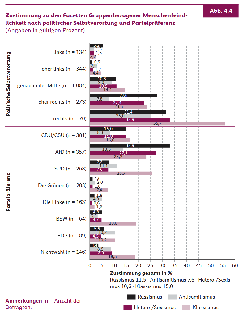 AfD-Anhänger:innen kommen im Vergleich der Parteipräferenzen insgesamt auf die höchste Zustimmung mit 33 % zu Rassismus, 27 % zu Hetero-/Sexismus und 13,5 % zu Antisemitismus.