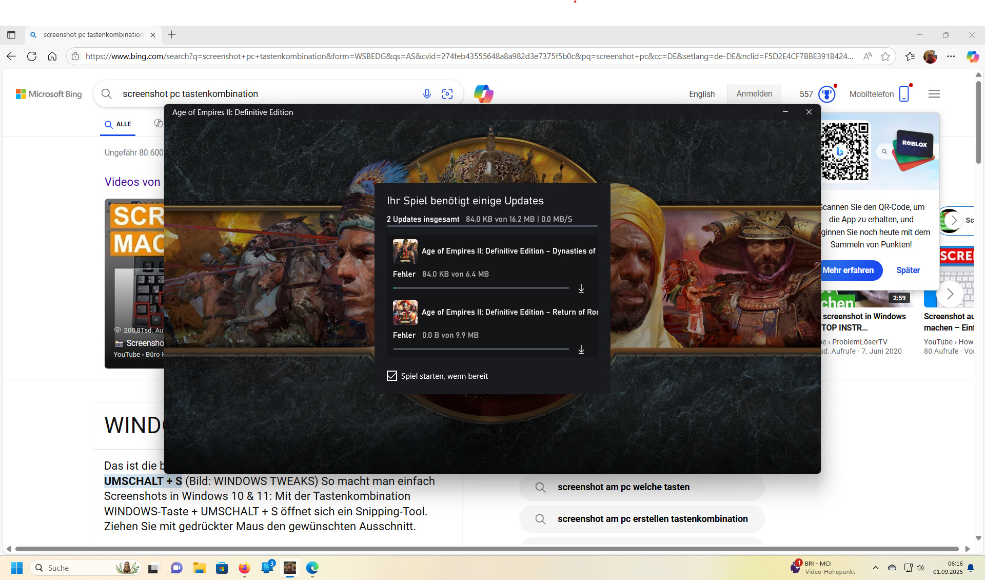 Jetzt wurde ein Download mit verschiedenen Updates gestartet und 2 der benötigten Downloads hängen mit „Fehler“. Spiel startet deswegen nicht mehr.