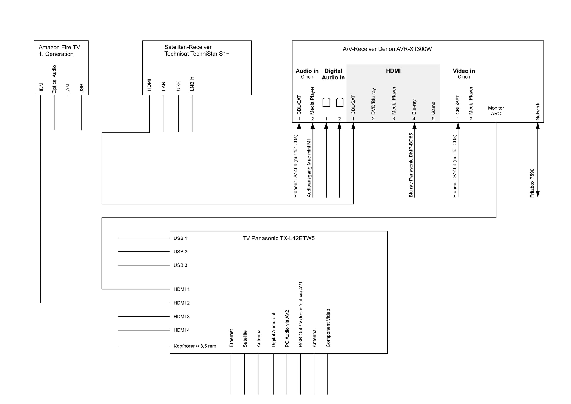 Ich benutze seit kurzem unsere alte Amazon Fire-TV 1. Generation (kleine Box) an meinem TV. Ich habe sie am Panasonic TV an HDMI_2 angeschlossen, bekomme aber keinen Ton, nur ein einwandfreies Bild. Zur Verdeutlichung habe ich ein Blockschaltbild meiner Anlage hier eingestellt. Ton und Bild meines SAT-Receivers an HDMI1 kommen einwandfrei an. Egal, welchen Kanal ich auf der Fernbedienung des A/V-Receivers einstelle, es ist nichts zu hören. Auch nach Umschalten über die Einstellungen im TV bleibt alles stumm.