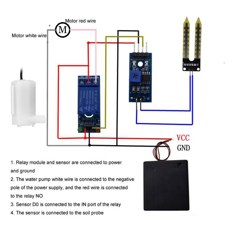 Das heißt, du nutzt COM und NO in deinem Pumpenschaltkreis, die Pumpe läuft dann, wenn das Relais wegen zu viel Trockenheit anzieht. Und die Relaiskarte selbst muss natürlich mit 5V über VCC und GND versorgt werden.