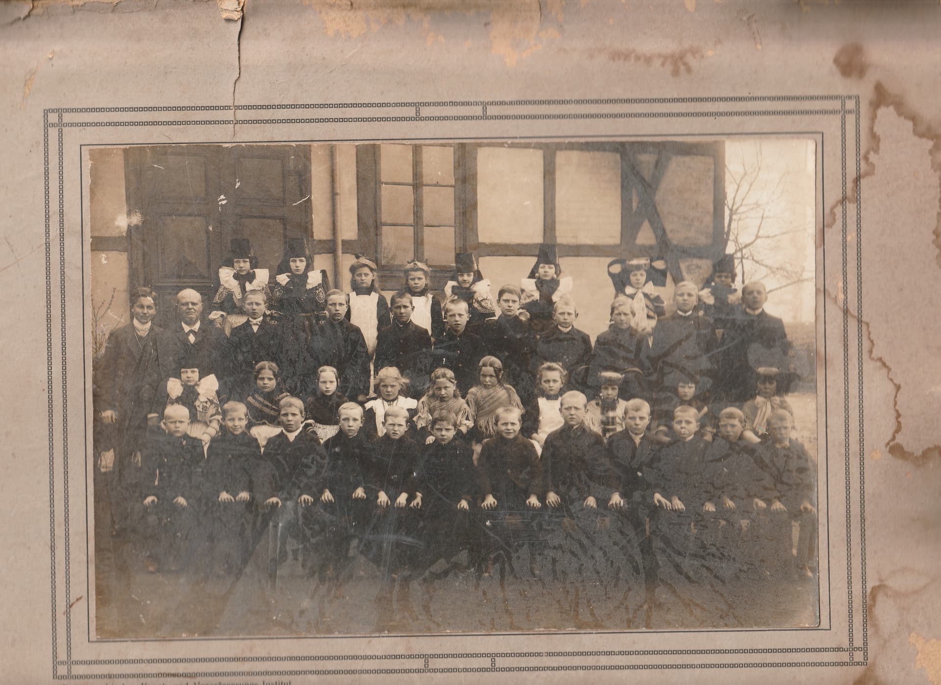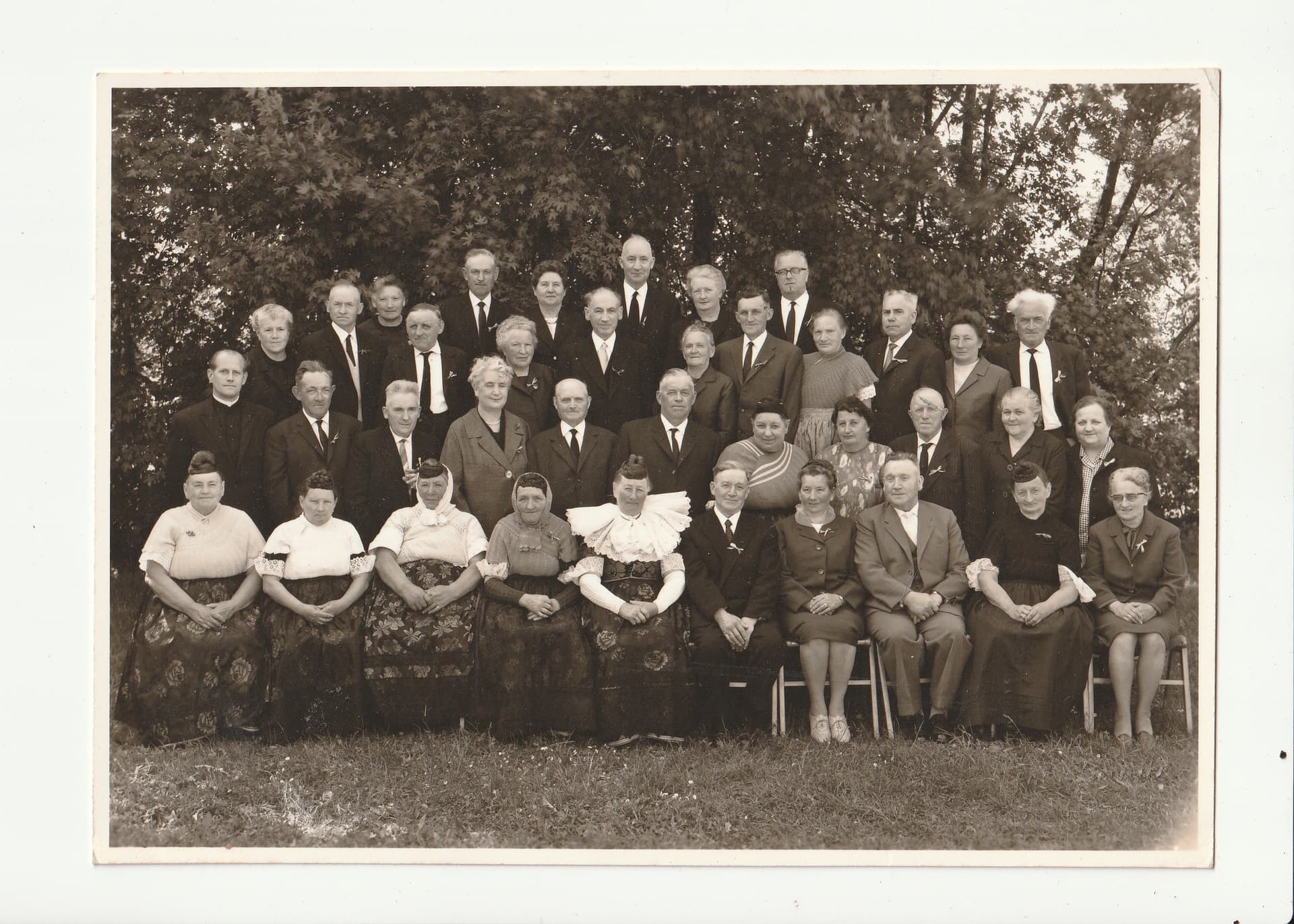 Falls es interessiert: Bei dem unteren Foto traue ich mich, es einem konkreten Anlass zuzuordnen. Die Anwesenheit eines Geistlichen und die glänzenden Anstecker an den Revers der übrigen Dargestellten, sowie deren Alter, lassen für mich eine goldene Konfirmation vermuten. Für eine silberne Konfirmation dürften die Dargestellten zu alt sein. Beiden Ereignissen ist aber ein silberner bzw. goldener Myrthen-Anstecker gemein.