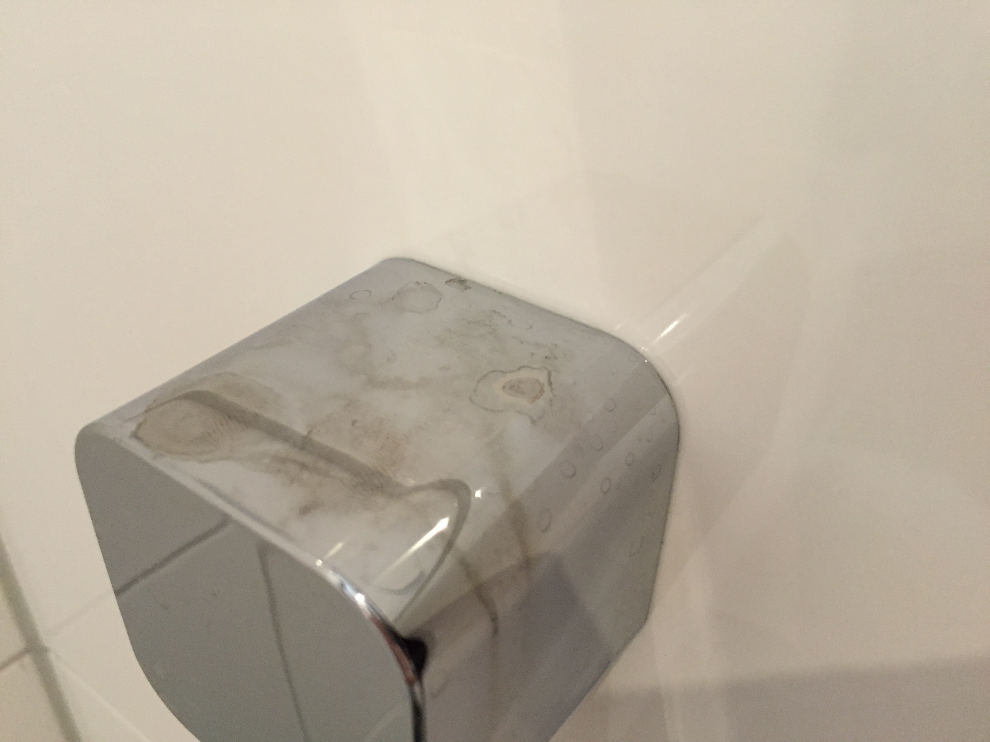 Es macht optisch aber wirklich den Eindruck, als wäre da etwas runter gelaufen. Unten die Tropfen, seitlich die Spuren, oben fast komplett. Der Reiniger wäre mein Favorit und der Installateur wird sicher auch auf der Schiene fahren.