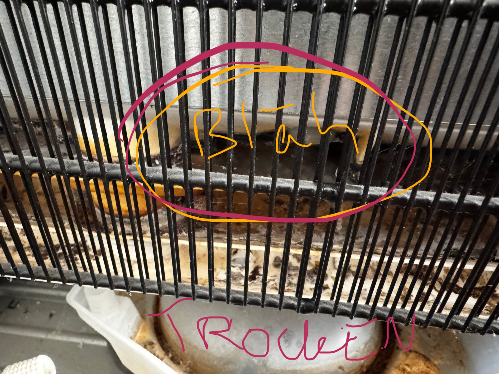 Das Wasser staut sich in diesen Rillen ÜBER der Auffangschale und findet keinen Weg hinunter. Wir haben das Gitter leicht weggeknickt und alles mit einer Flaschenbürste gereinigt, um bessere Sicht zu haben… trotzdem finden wir nicht heraus wie das Wasser nun eigentlich in die Schale gelangen soll. Für uns auch ein Konstruktionsfehler.