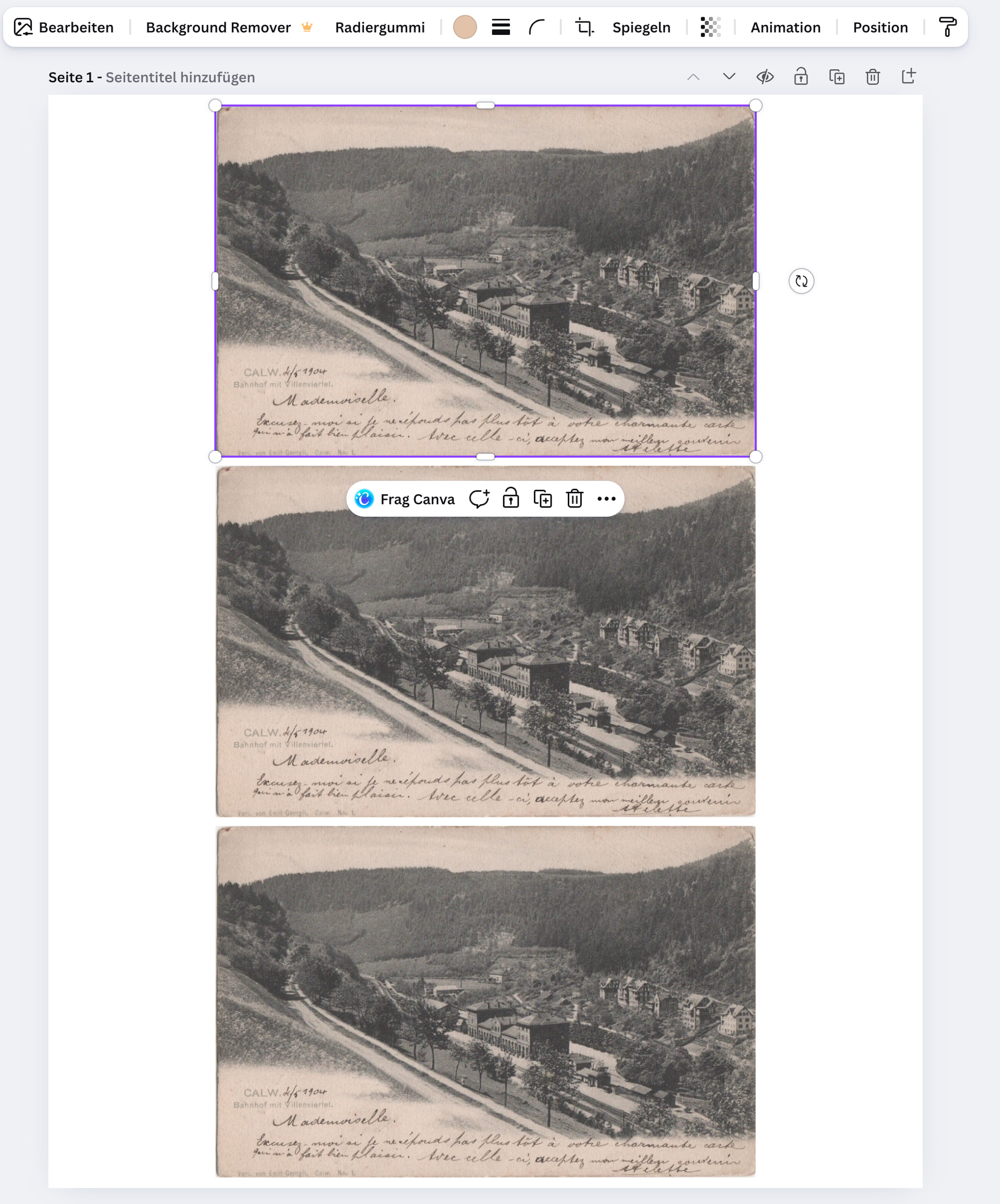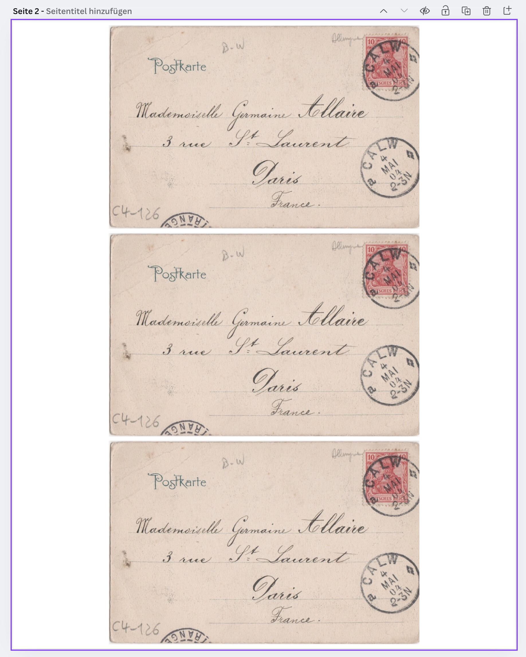 Hallo, ich möchte Kopien von meinen Postkarten erstellen, um sie zu drucken. Dazu habe ich die Vor- und die Rückseite mit 300 dpi eingescannt und versuche mit Hilfe von Canvas, eine Vorlage zu erstellen: auf einer Seite, 3 Postkarten quer unter einander: auf der einen Seite die Vorderseiten, auf der anderen Seite die Rückseiten der Postkarten. Um zu erreichen, dass die Vorderseite der Postkarte und ihre Rückseite genau übereinander liegen, muss ich die Scanns richtig positionieren. Das fertige Dokument möchte ich in .pdf umwandeln und der Druckerei geben, damit die Postkarten auf 250 g / m² Papier gedruckt werden. Die dafür nötige Formatierung schaffe ich jedoch nicht. Wie soll ich es am besten machen, damit die beiden Seite genau über einander liegen. Kann mir jemand helfen?