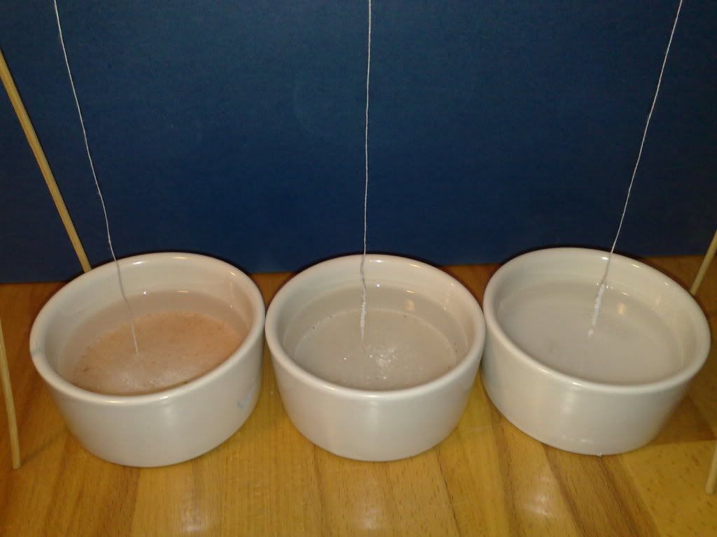 Dabei aber darauf achten, dass die Bedingungen wirklich gleich sind, z.B. wirklich gleiche Salzmengen nehmen, auf gleiche Temperatur achten und den Faden erst reinhängen, wenn Salz sich vollständig aufgelöst hat.