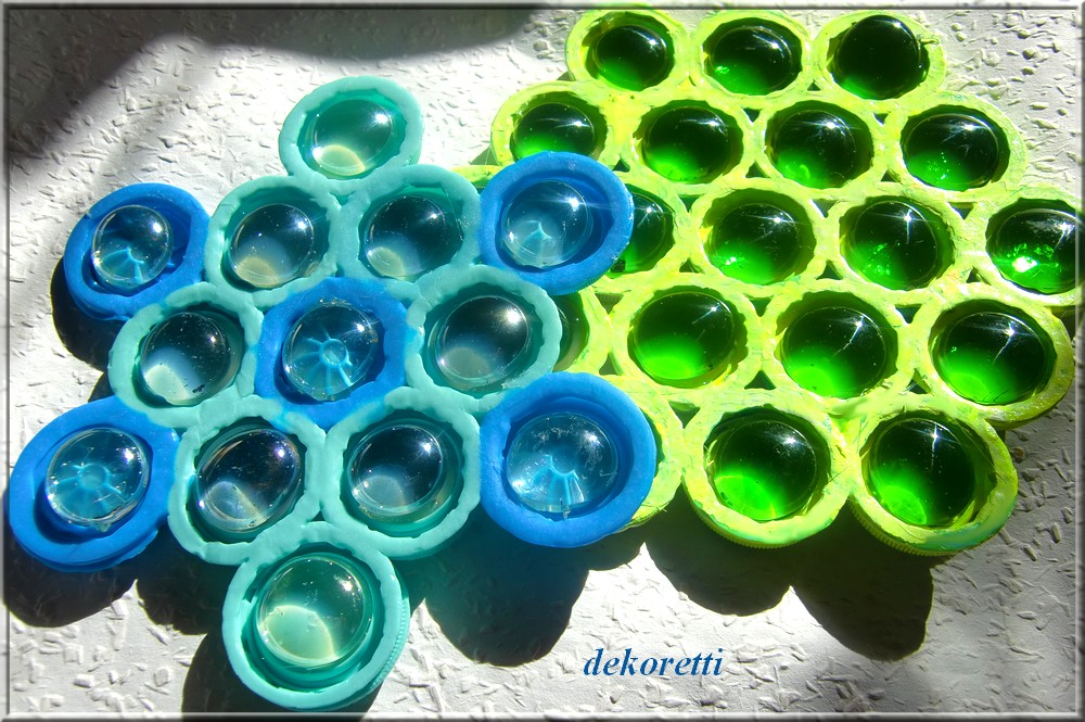 Hi, ich hab gerade nach neuer Deko gesucht, die ich evtl selbst machen kann. Und da ist mir ein Muster aufgefallen, das mit Plastikdeckeln gemacht wurde. Kennt ihr doch dies Formen, auf die man die Plastikdinger da drauf steckt, bügelt und dann hat man eine schöne Form zum aufhängen? Ich hab so ein Teil mal von den Nachbarskindern gescheckt bekommen. Die waren total stolz drauf.
