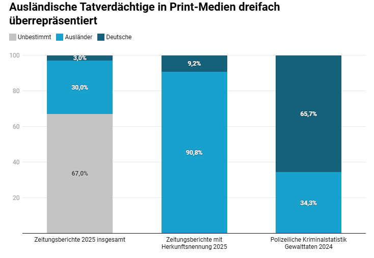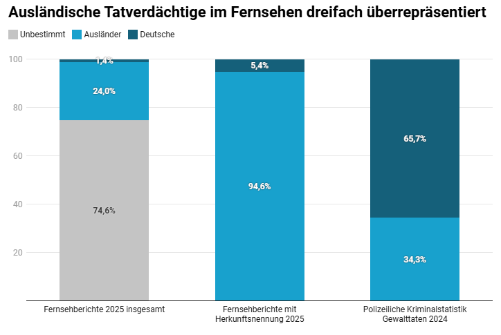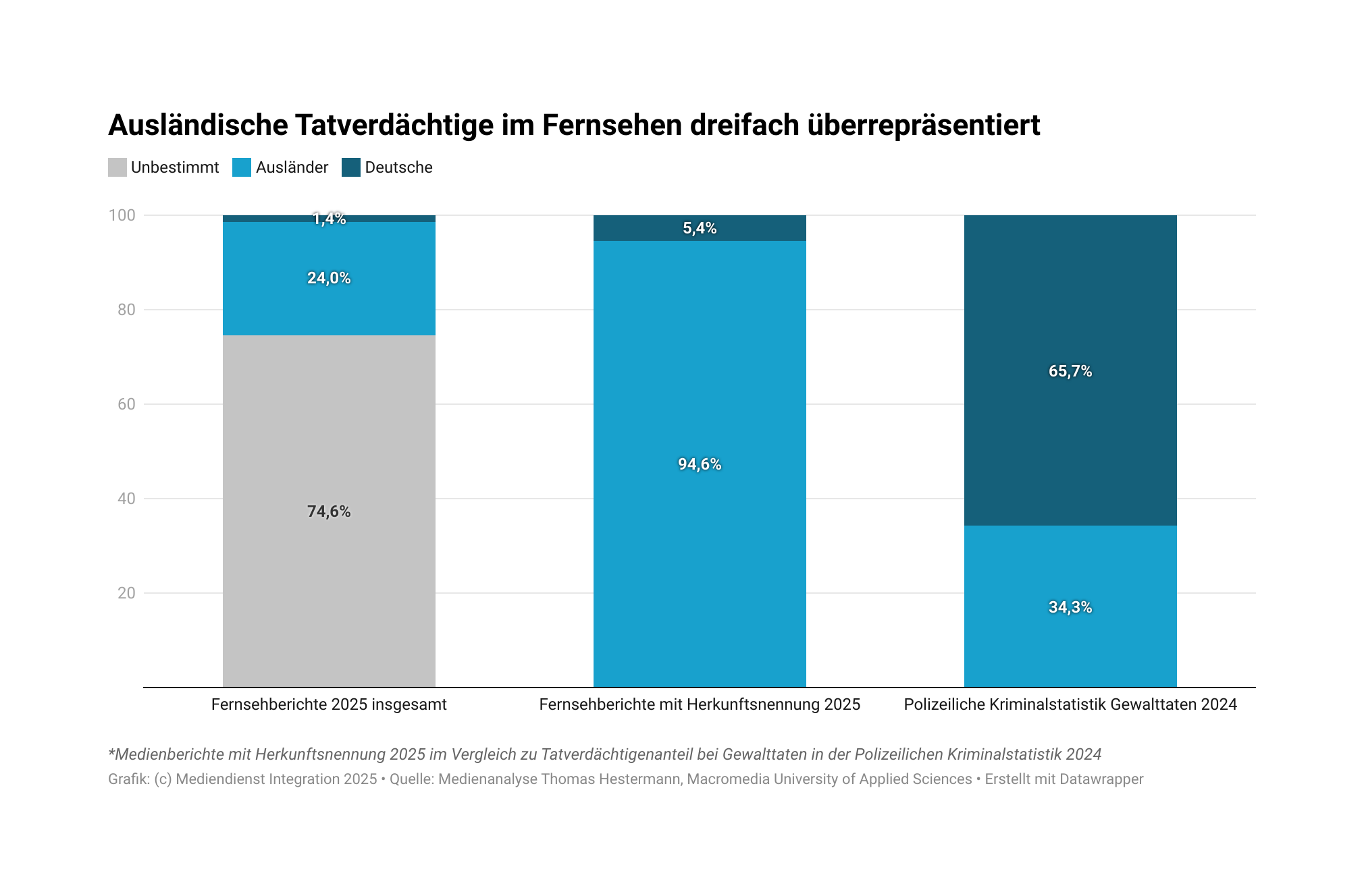 Ein weiteres Muster zeigt sich sowohl in den untersuchten Fernsehformaten als auch in den überregionalen Tageszeitungen: Soweit die Herkunft genannt wird, stammen 70,3 Prozent (Fernsehen) bzw. 70,1 Prozent (Printmedien) der Tatverdächtigen aus mulimisch geprägten Ländern. Laut Polizeilicher Kriminalstatistik ist der Anteil dieser Länder mit 15,8 Prozent deutlich geringer. Personen aus muslimisch geprägten Herkunftsländern sind somit in den Medien mehr als vierfach überrepräsentiert.