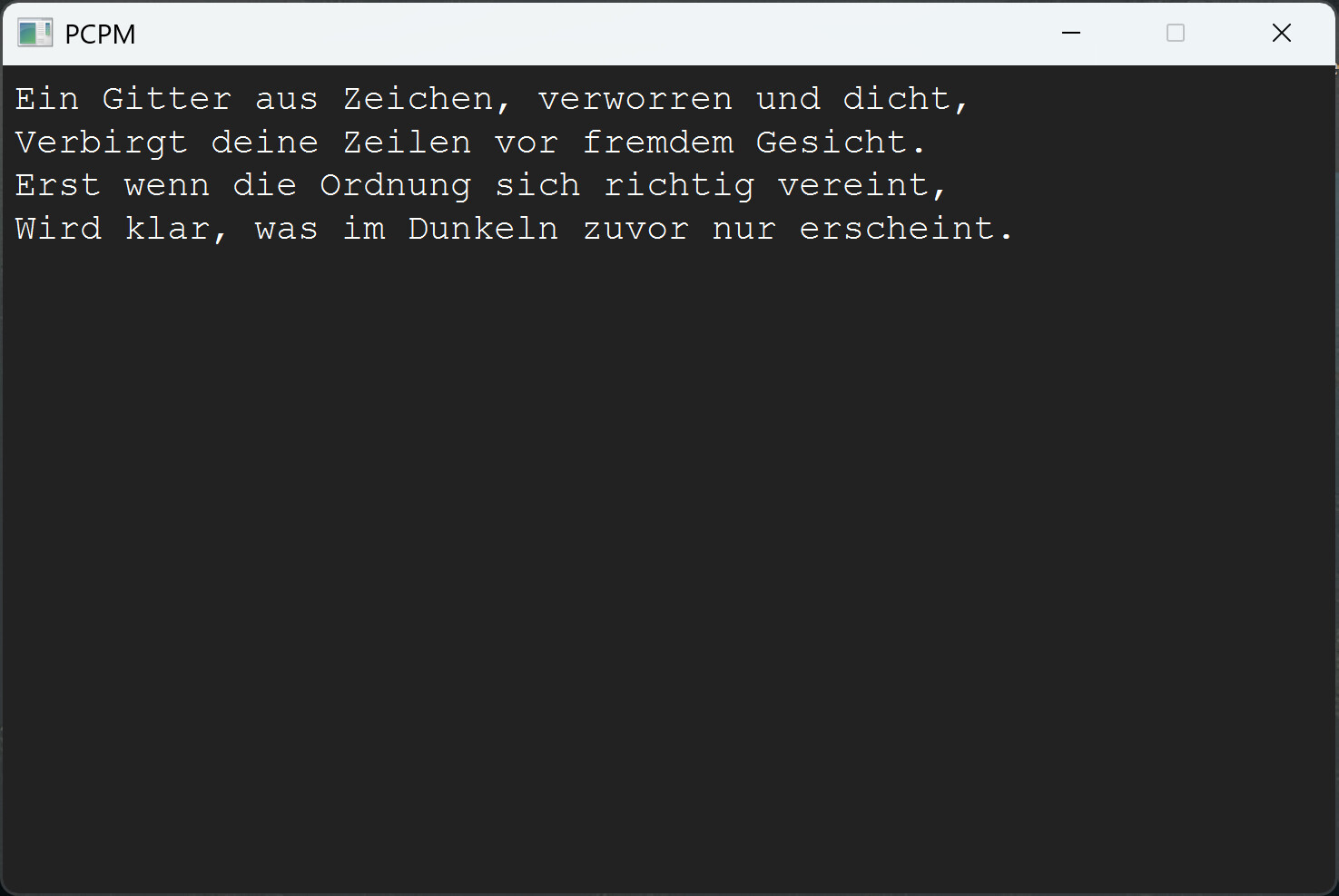 Mein Programm (native EXE für Windows) macht sich langsam. Wie gesagt, nur ein kleines Tool um Texte mit meiner eigenen Verschlüsselungsmethode abzuspeichern. Das Tool kommt dann auf USB, so per Autostart wird es dann gestartet. Werde dann noch was einbauen, damit das Tool nur von diesem USB Stick funktioniert. Aber sollte mal jemand den Stick haben, kommt erst mal das hier: