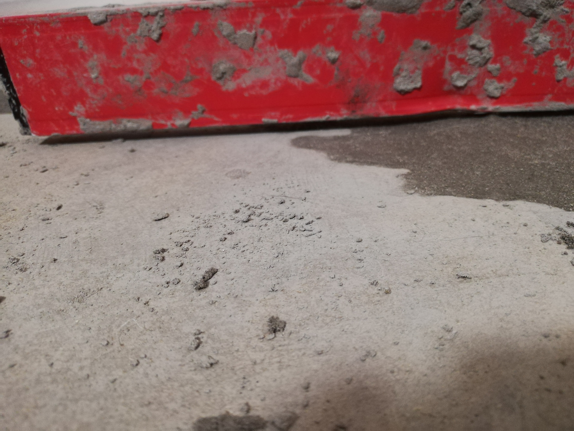 Sollte der Boden in allen Richtungen schief sein, dann vorher eben 2 Lehren herstellen (2 bis 5cm breit, mehr muss nicht sein) und wenn die trocken sind, dann darauf abziehen.