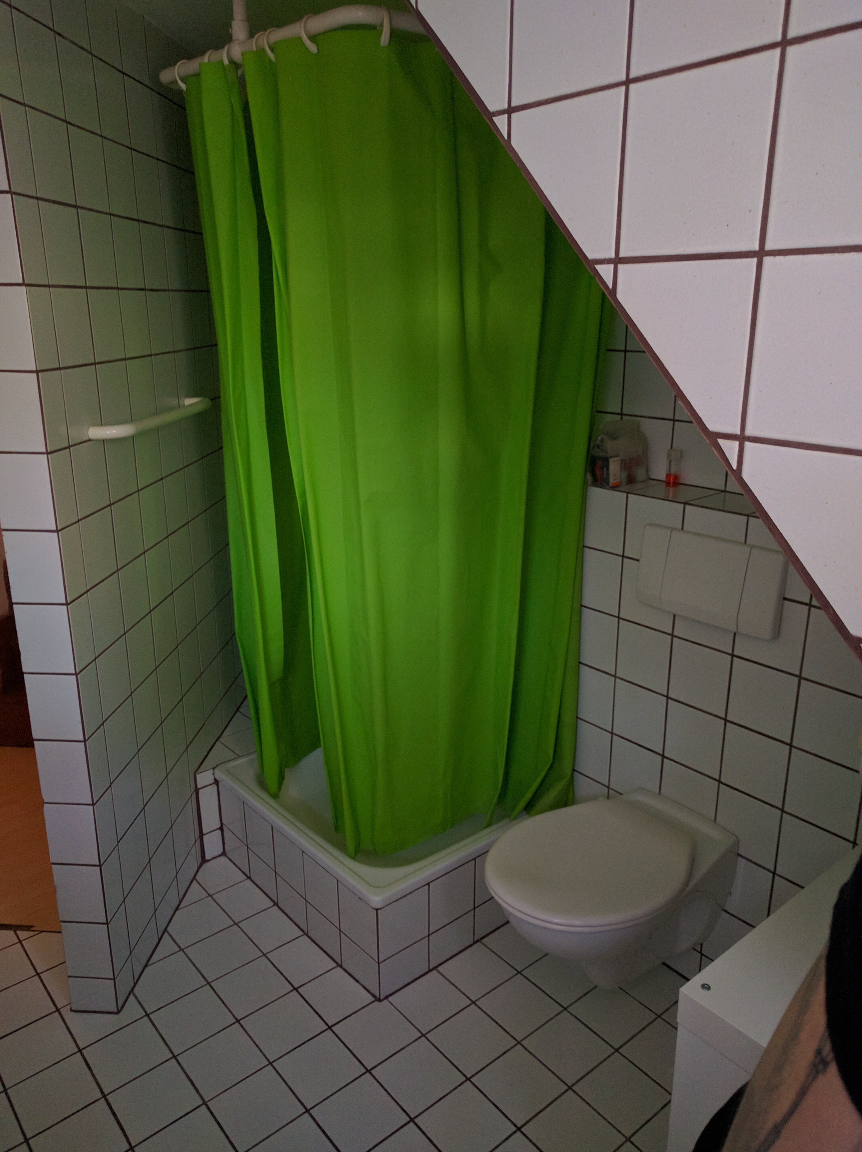 Die ganze Lösung mit der Dusche in der äußerst ungünstigen Ecke ist unglücklich.