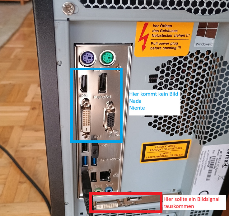 Noch einmal die Wiederholung: die rot markierten Anschlüsse sind die der Grafikkarte. Die anderen weiter oben sind die der „Grafikkarte“, die sich quasi auf dem Mainboard befindet. Die wahrscheinlichste Fehlerursache ist, dass Du den Monitor mit einem der Anschlüsse der Grafikkarte auf dem Mainboard verbunden hast. Diese sind aber, wie auch schon geschrieben wurde, von der eigentlichen Grafikkarte deaktiviert worden.