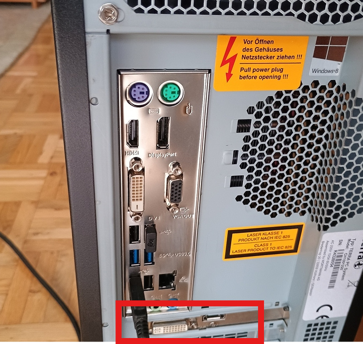Du solltest also den Monitor entweder mit dem DVI- oder dem HDMI-Anschluss verbinden, die auf dem Foto mit einem roten Rechteck gekennzeichnet wurden.