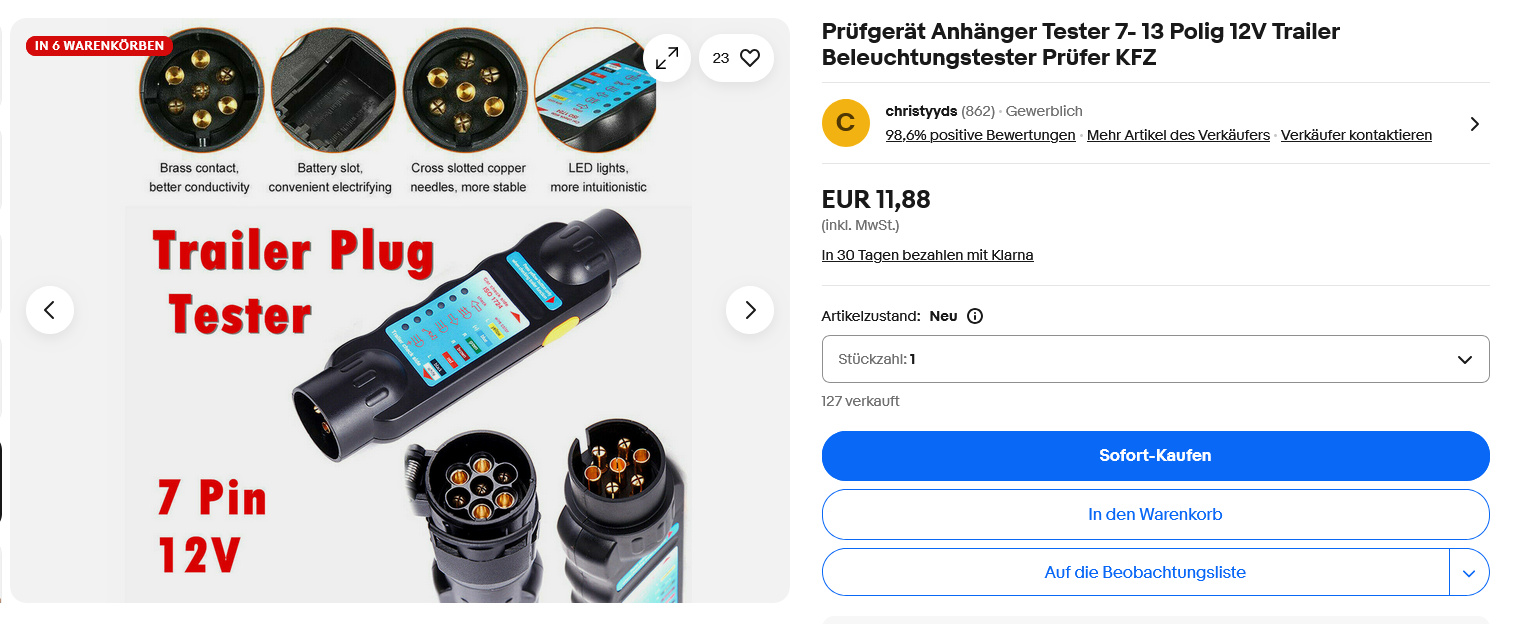 @X_Strom hat schon Recht, das geht wesentlich günstiger, zumal dieser Tester die Leitungen des Anhängers sogar mittels eingebauter Batterie und ohne 12V-Versorgung auf Durchgang prüfen kann und so schon durchgebrannte Birnen erkennt.
