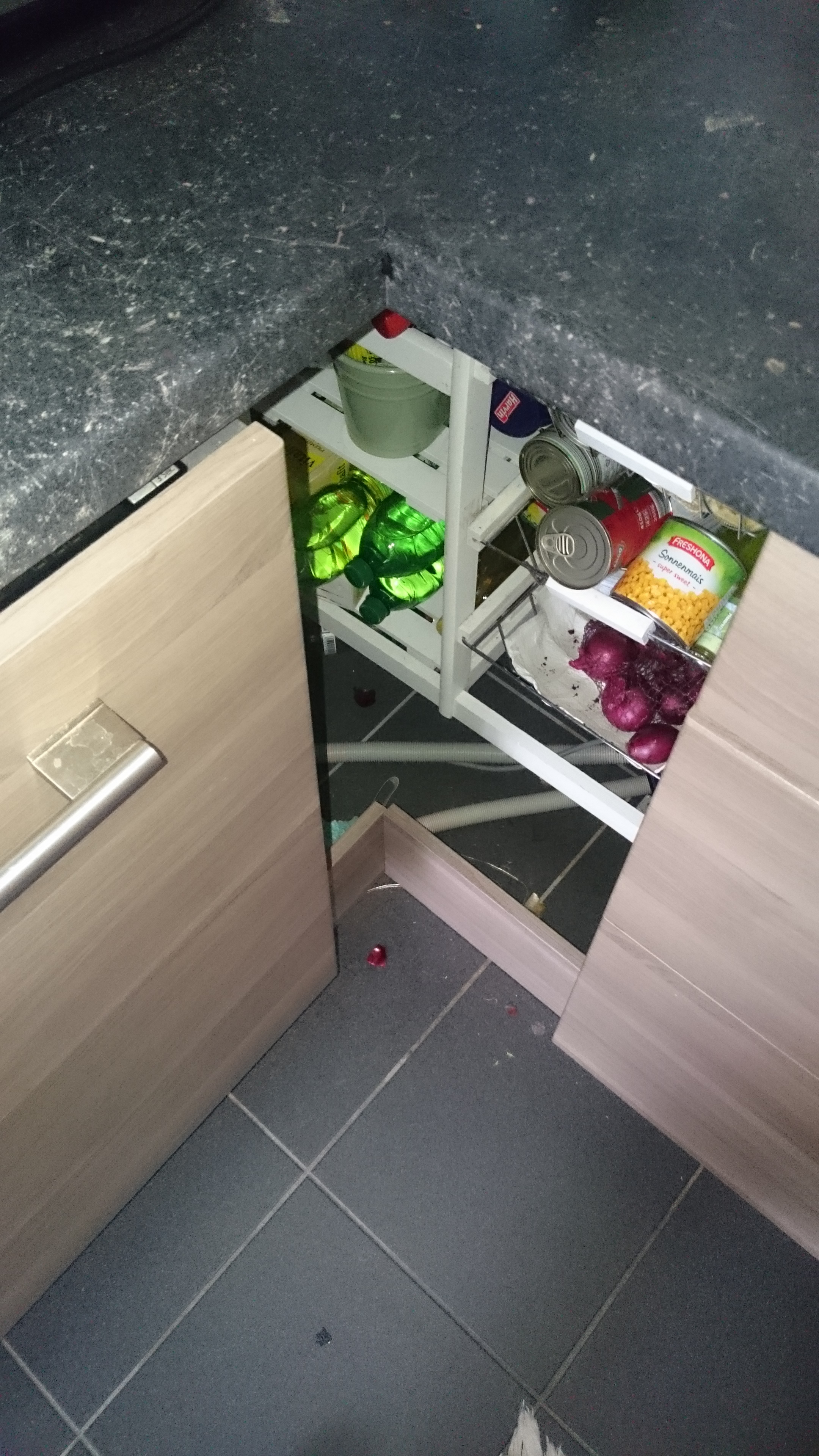 Bei mir würde erst mal der linke Unterschrank mit Schublade verschwinden. Wenn möglich Tausch gegen ein Teil mit Einlegeböden von etwa 100 cm Länge. Und unter die Arbeitsplatte geschoben bis in die Ecke. Die Türen so zugeschnitten, dass über ein Klavierband eine 2- geteilte Tür die Ecke schließt. Zusätzliche Bretter auf die Einlegeböden gelegt und am rechten Unterschrank verschraubt, ergeben zusätzliche Ablagefläche.