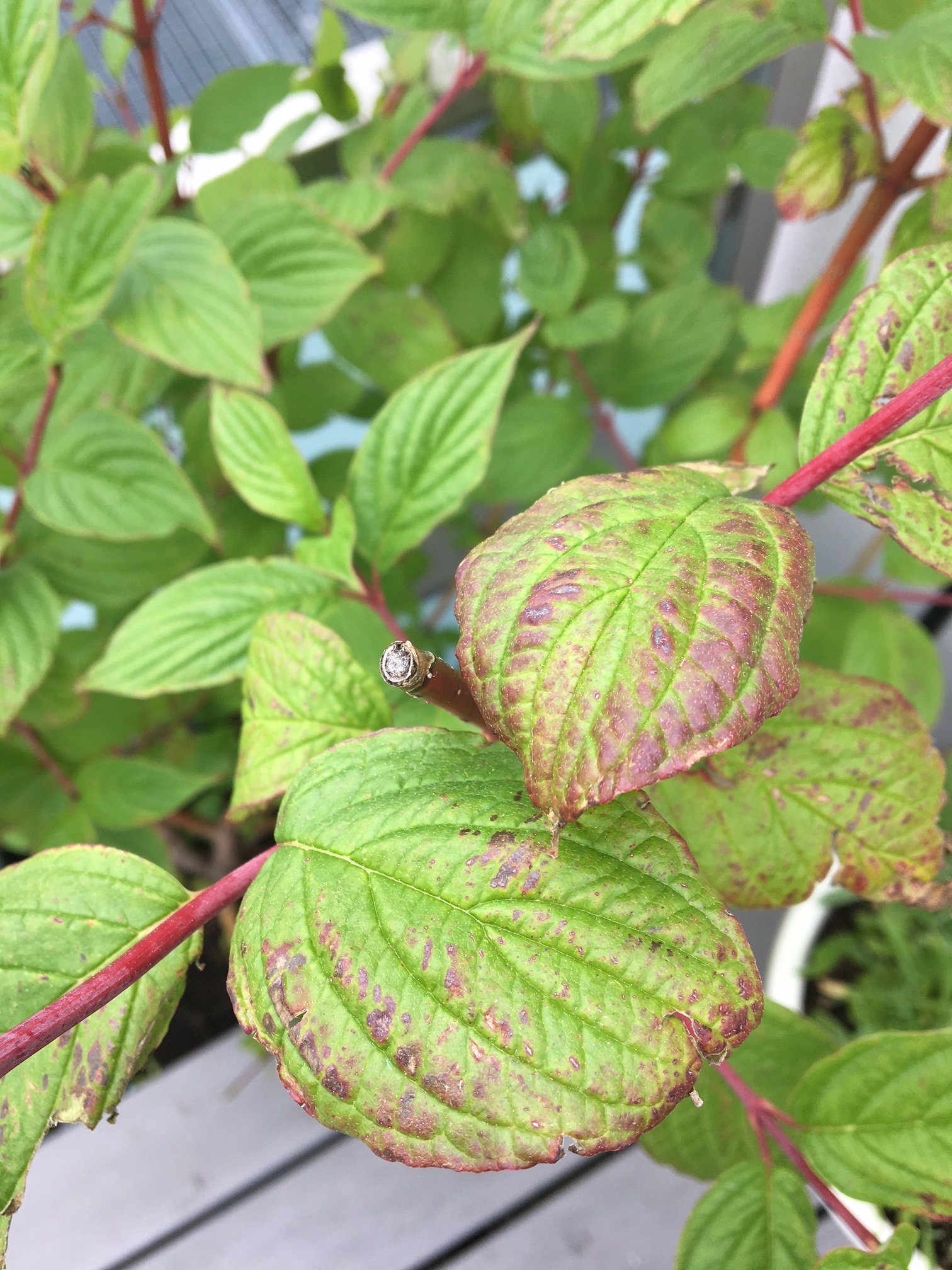seit neuestem sehen die Blätter unseres Hartriegel sehr mitgenommen aus.