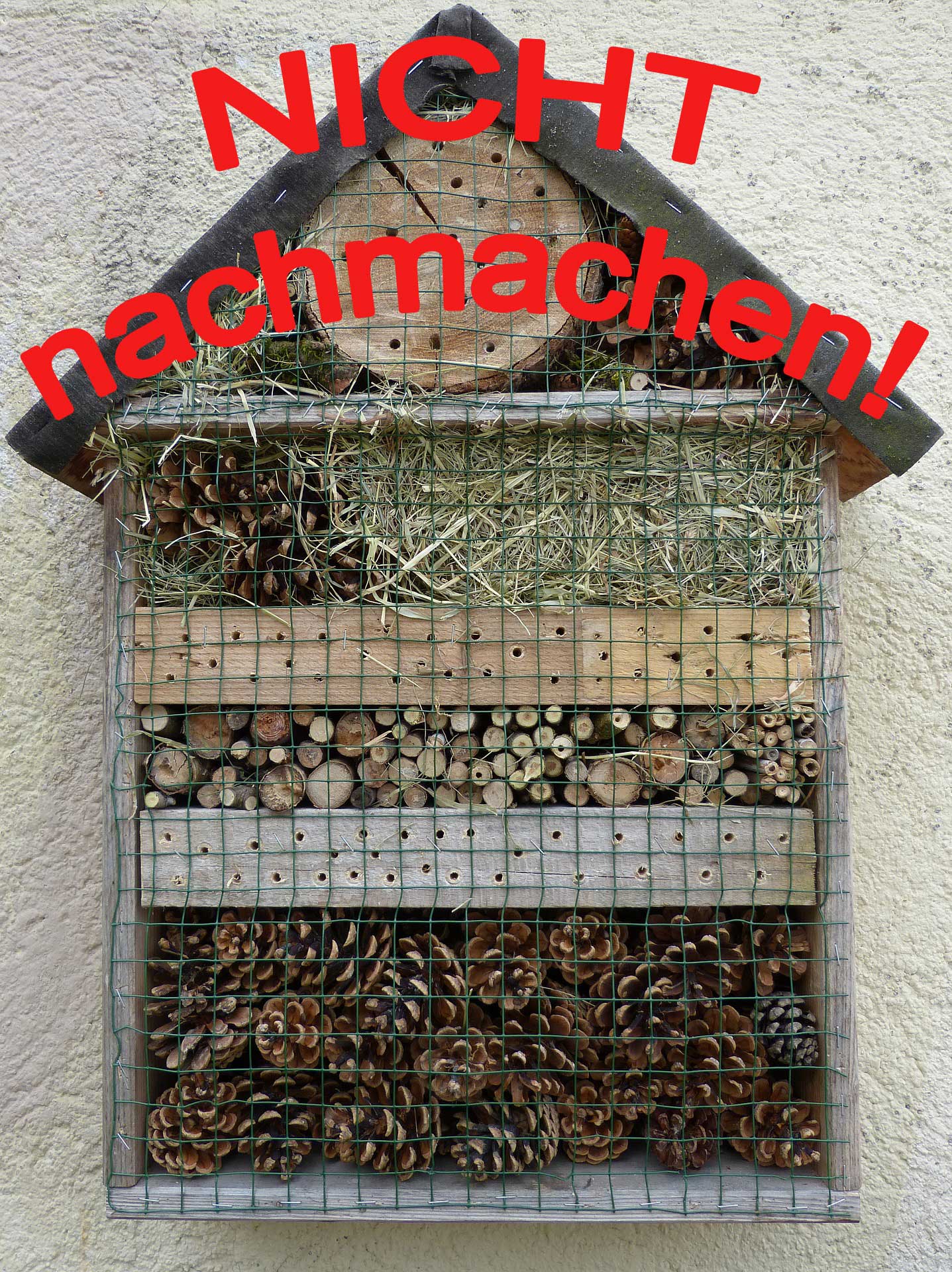 ich habe kürzlich irgendwo einen Kasten gefüllt mit Zapfen und an einer Seite mit Hühnerdraht „geschlossen“ als Insektenhotel stehen sehen.