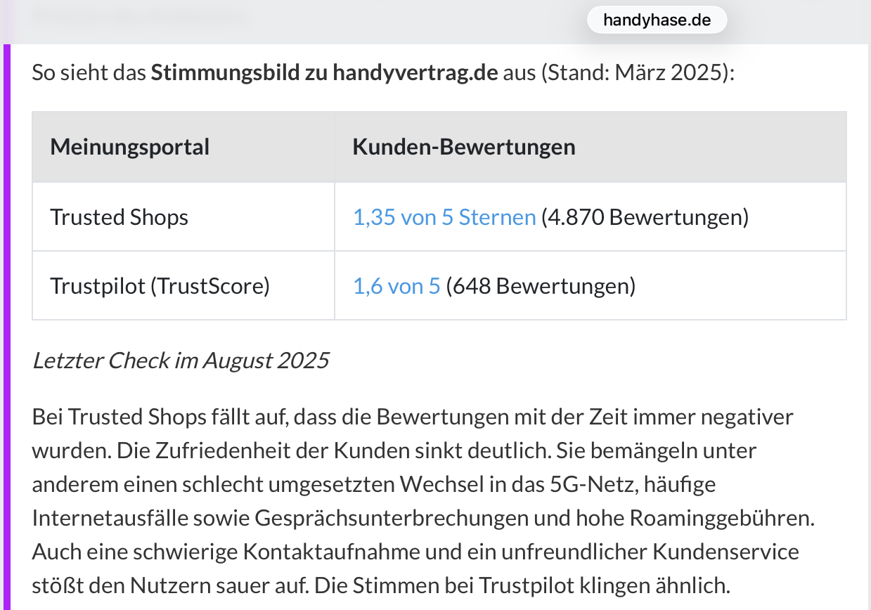 Verivox versagt an einer Testadresse in meiner Umgebung, weil es dort nur das DSL-Kupfernetz (mit maximal 2 Mbit/s) und das Glasfasernetz (wird aber erst im Frühjahr 26 fertig!) kennt. Den lokalen Netzbetreiber, der sein Netz ausschließlich drei Anbietern aus der Region zur Verfügung stellt, ignorierte Verivox. An derselben Testadresse gibt Check24 immerhin einen der drei Anbieter an.