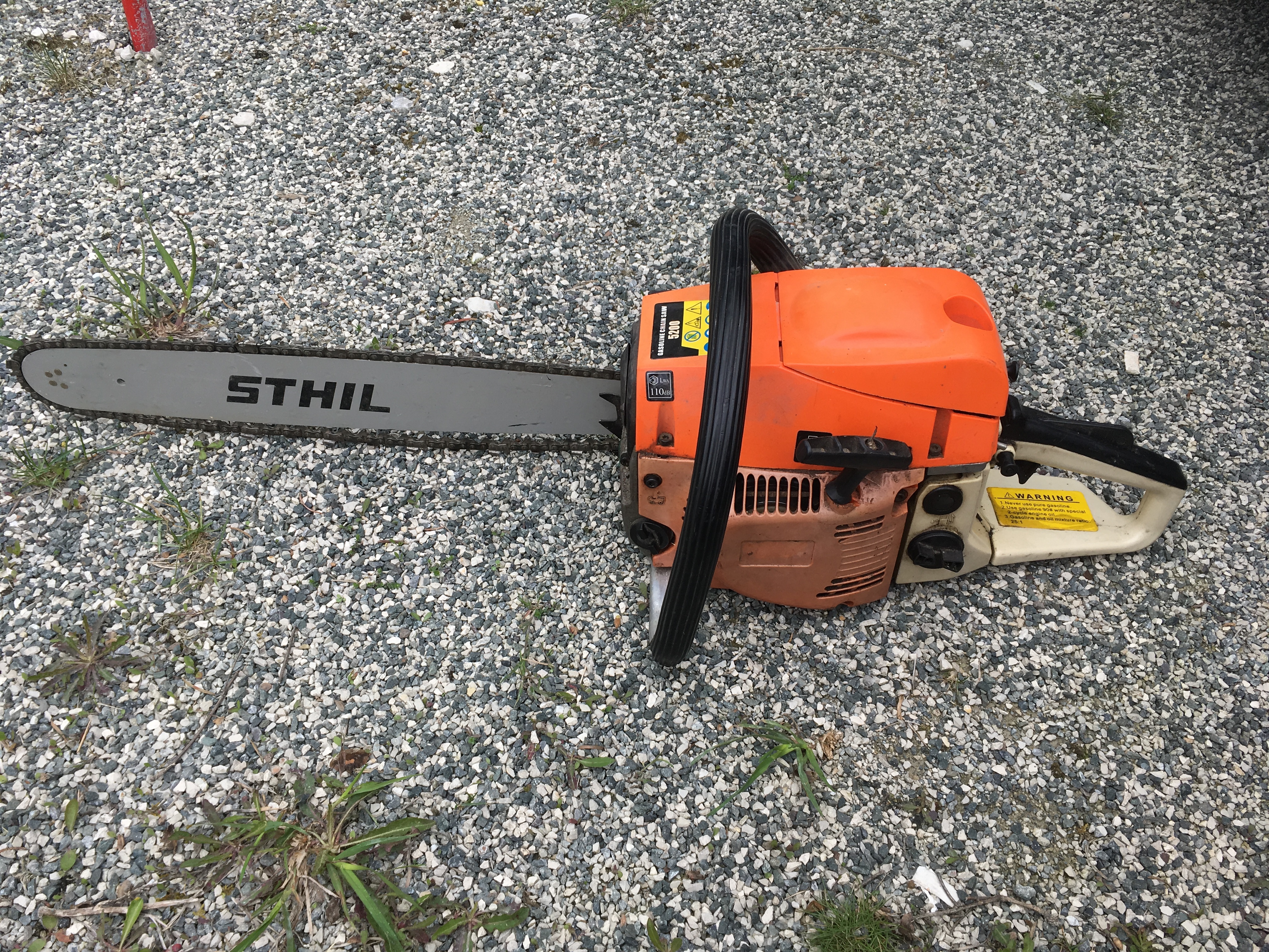 Also wenn die Säge original sein sollte, hat da auf alle Fälle einer dran rumgespielt. Starter und Deckel sehen nicht wirklich original aus. Weiterhin fehlt komplett der Handschutz. Das ist schon recht haarig.