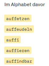 Auf der betreffenden Duden-Seite ganz nach unten scrollen (→ Blättern); dort findest Du die Wörter, die im Alphabet vor und nach dem gefundenen Begriff angezeigt werden, siehe z. B. auffinden: