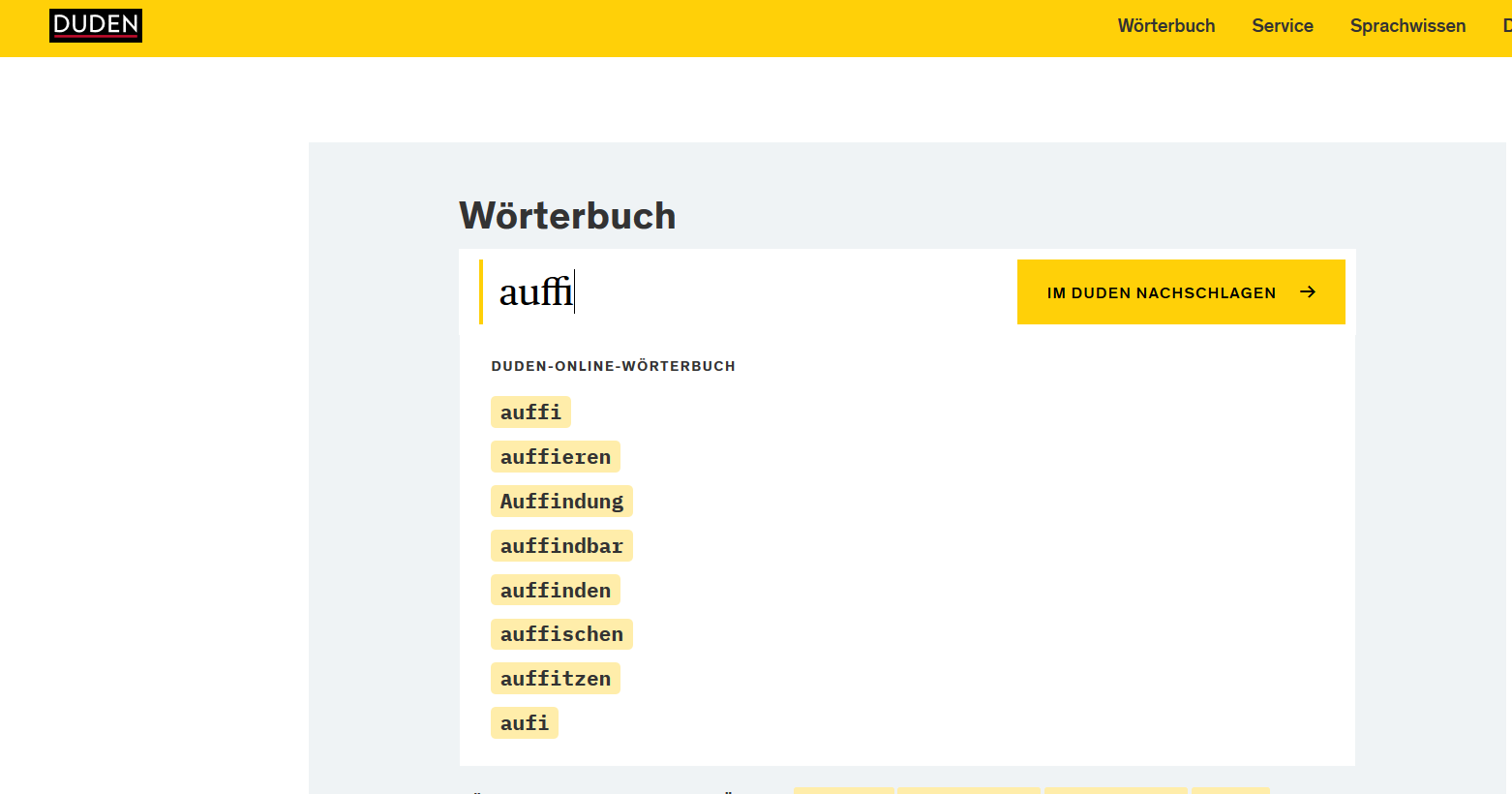 Kleiner Tipp, wie Du Dir das Finden manchmal leichter machen kannst: Im Online-Duden werden schon während der Eingabe des Suchworts Vorschläge angezeigt - so erscheint „auffindbar“ (an 4. Stelle in der Liste) bereits nach Eintippen von „auffi“: