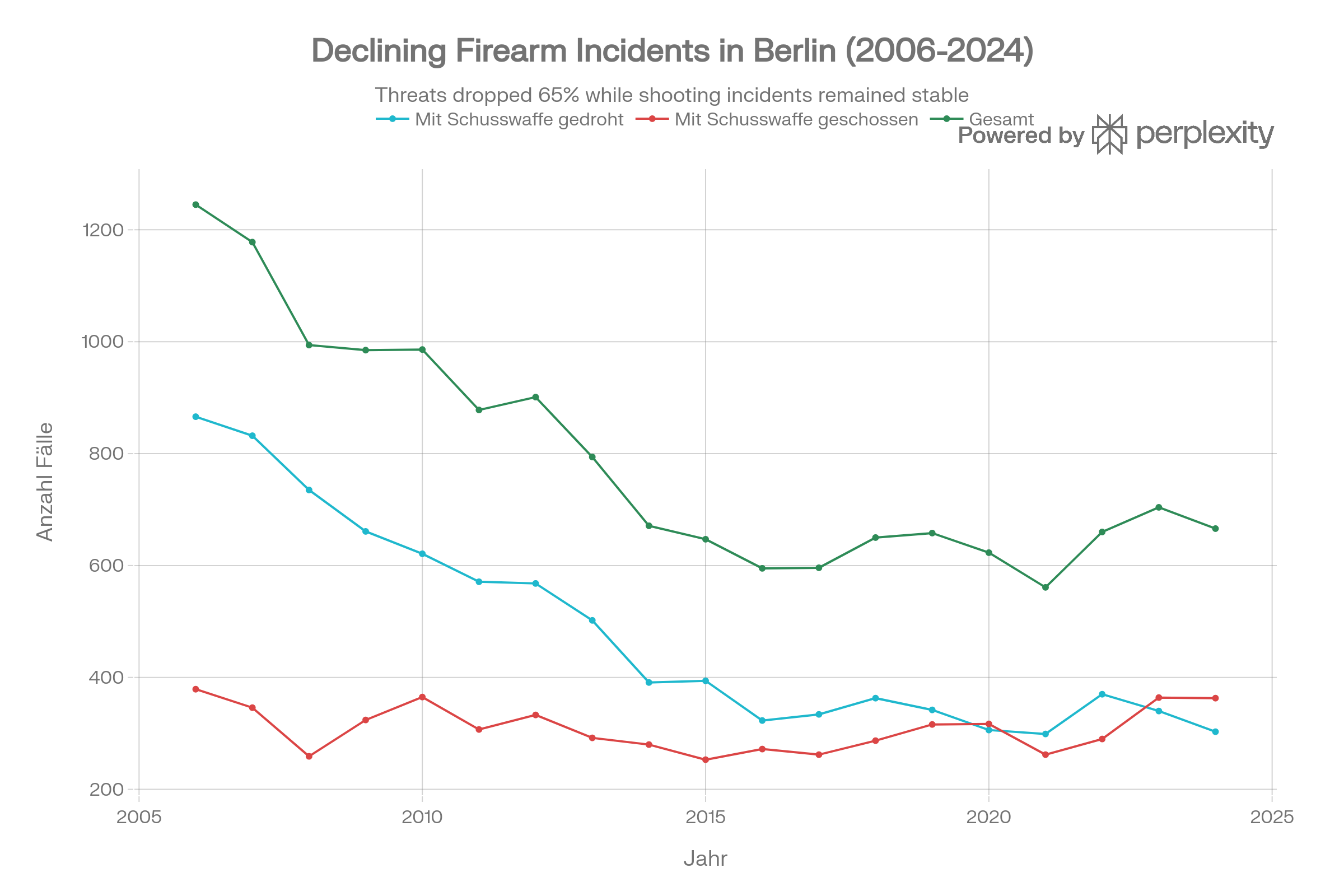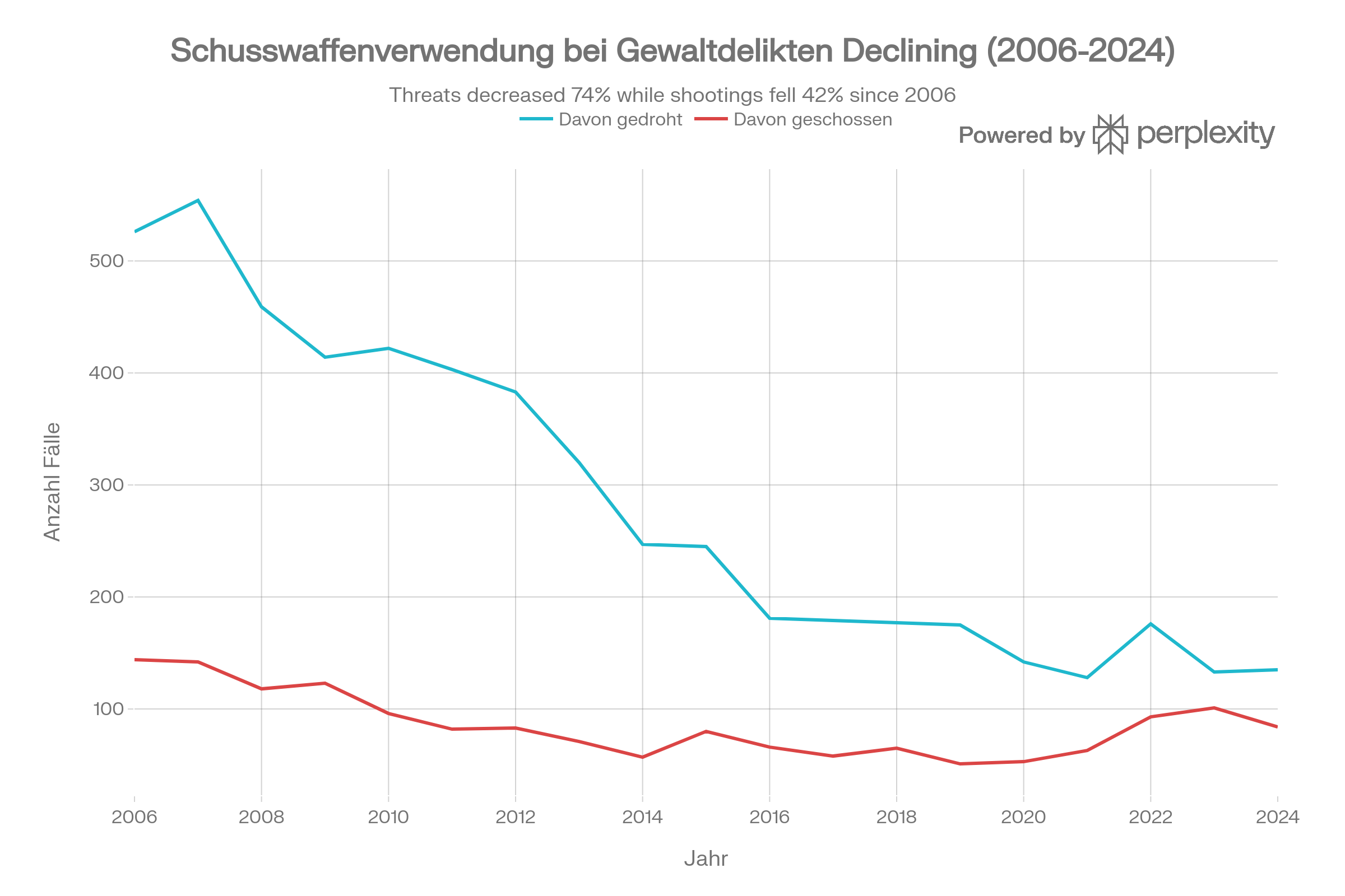 Wie man sieht, gibt es von 2005 bis 2010 einen deutlichen Rückgang bei der illegalen Schusswaffenverwendung und seit 2015 relativ stabile Werte ohne klaren Trend.