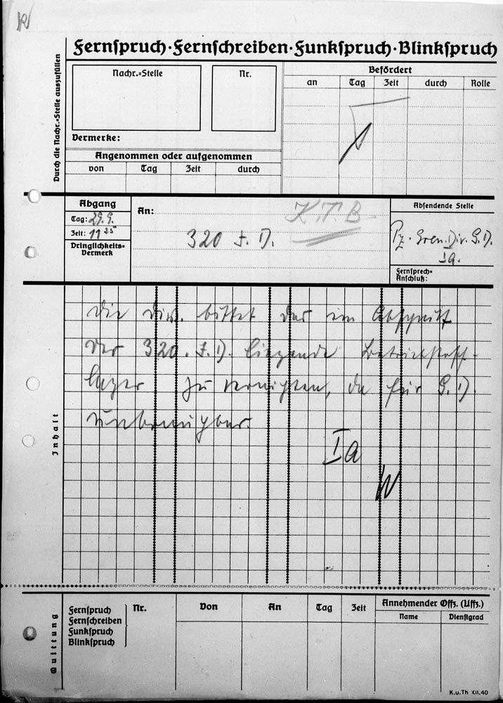 Die Div(ision). bittet das im Abschnitt der 320. I(nfanterie).D(ivision). liegende Betriebsstofflager zu vernichten, da für G(renadier) D (ivision) unbenutzbar.