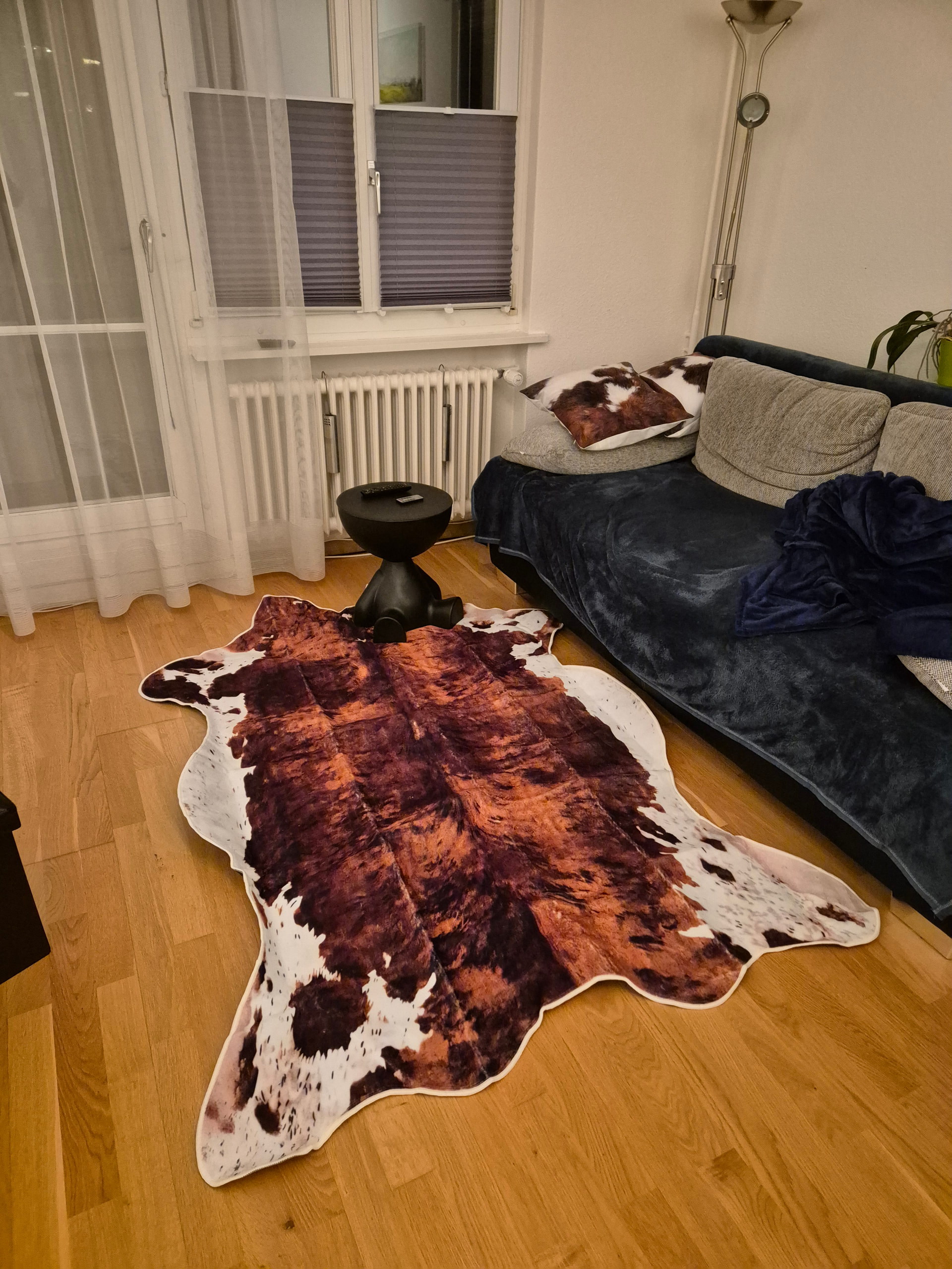Ich hab von meiner Partnerin dieses Kuhfell Imitat bekommen. Wie krieg ich jetzt die Falten raus, damit es flach auf dem Boden liegt ?