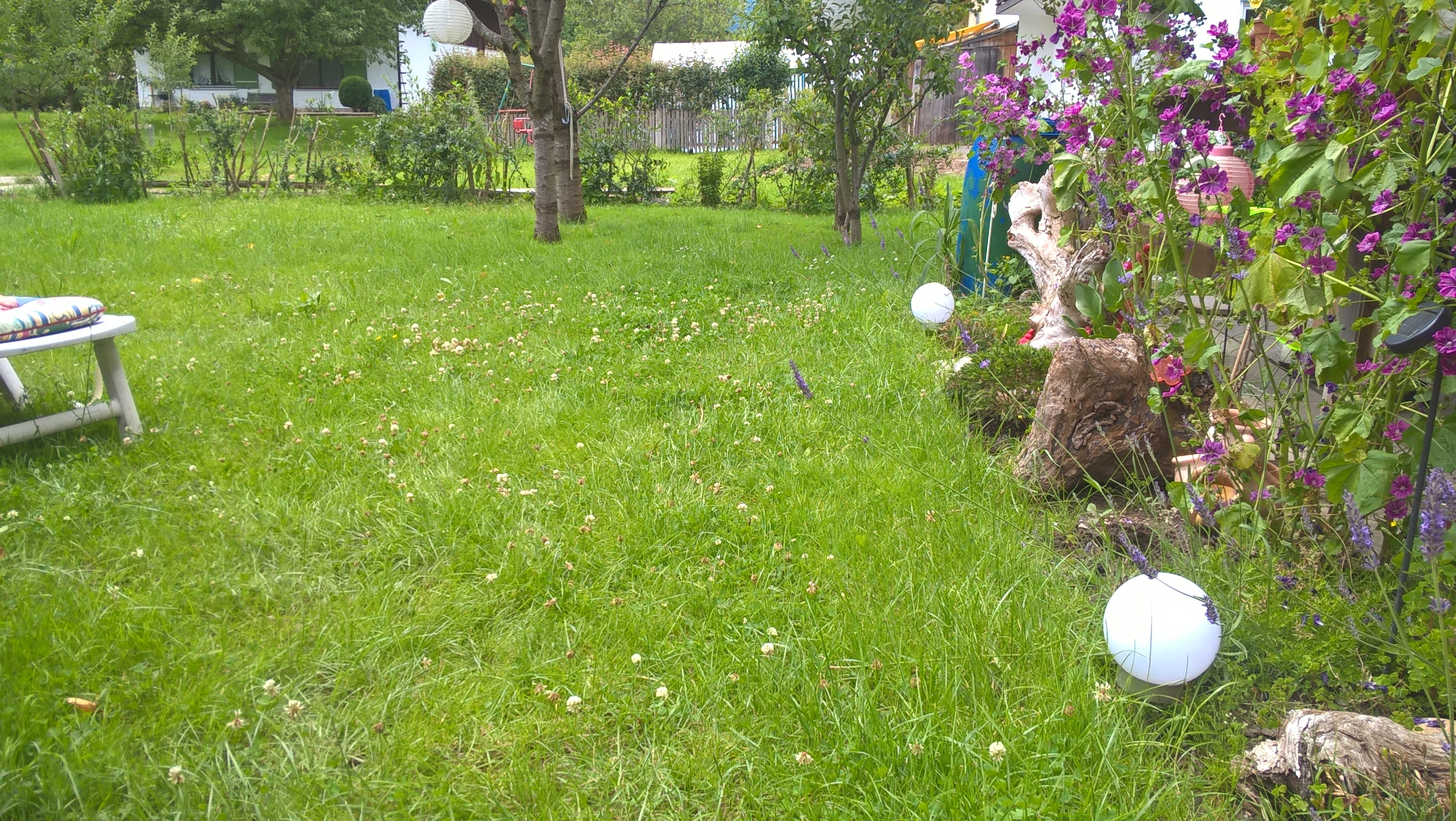 Mein Rasenroboter - naja, eher "Wiesen"roboter, weil ich eine gröĂere WiesenflĂ€che habe - schnippselt so wenig weg, dass GĂ€nseblĂŒmchen &Co sehr wohl blĂŒhen, der GK-Teppich (Gras-Klee-Teppich) angenehm zu betreten ist und wunderschön grĂŒn ist.