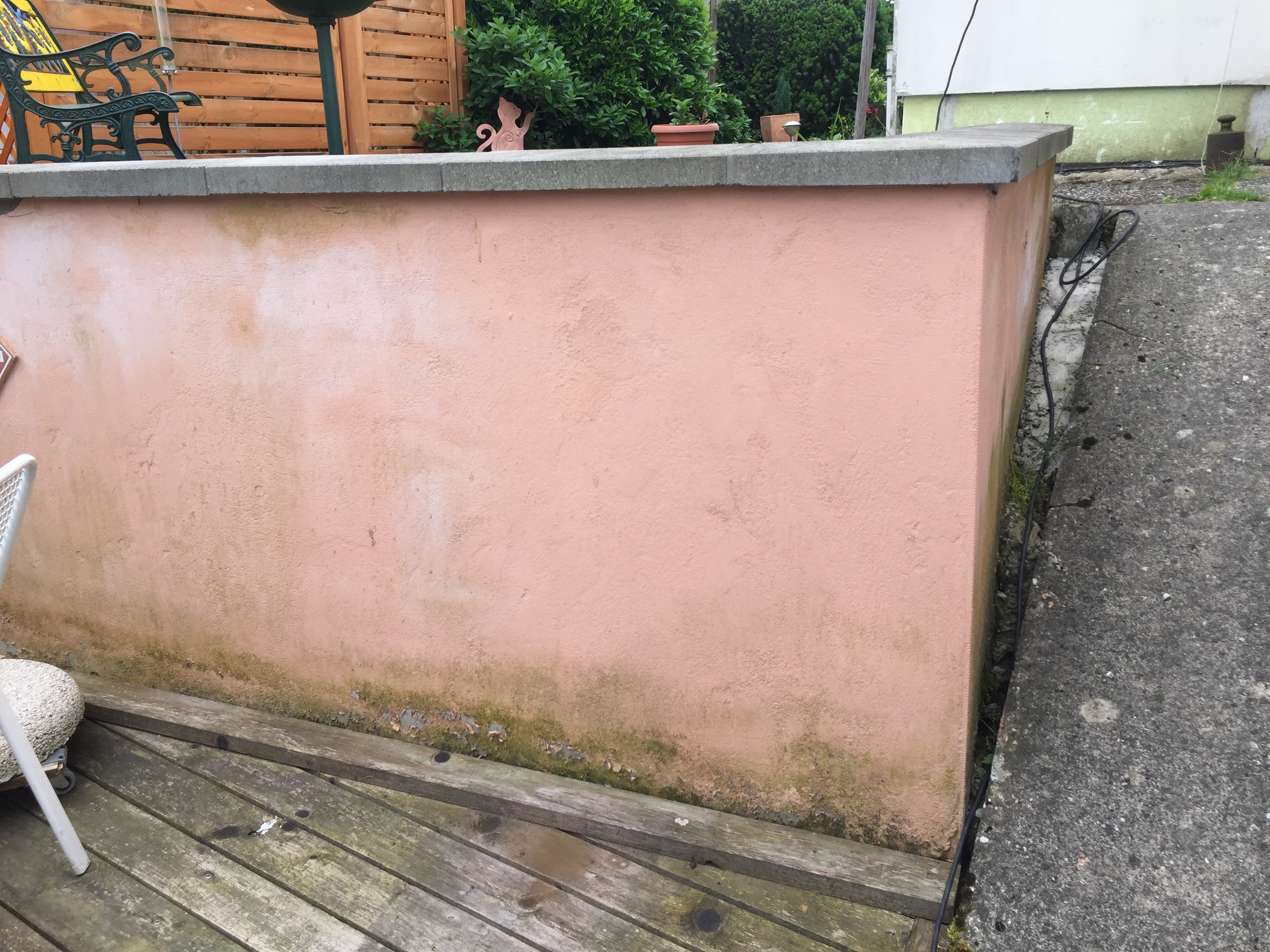 Wenn wir mal davon ausgehen, dass der Putz am Haus gerade ist, hat die Betonplatte Gefälle zum Weg hin. Das könnte man ja nach hinten ändern, um die Wand zu schützen. Aber nur, wenn sie von hinten - unter der Erde - auch geschützt ist.