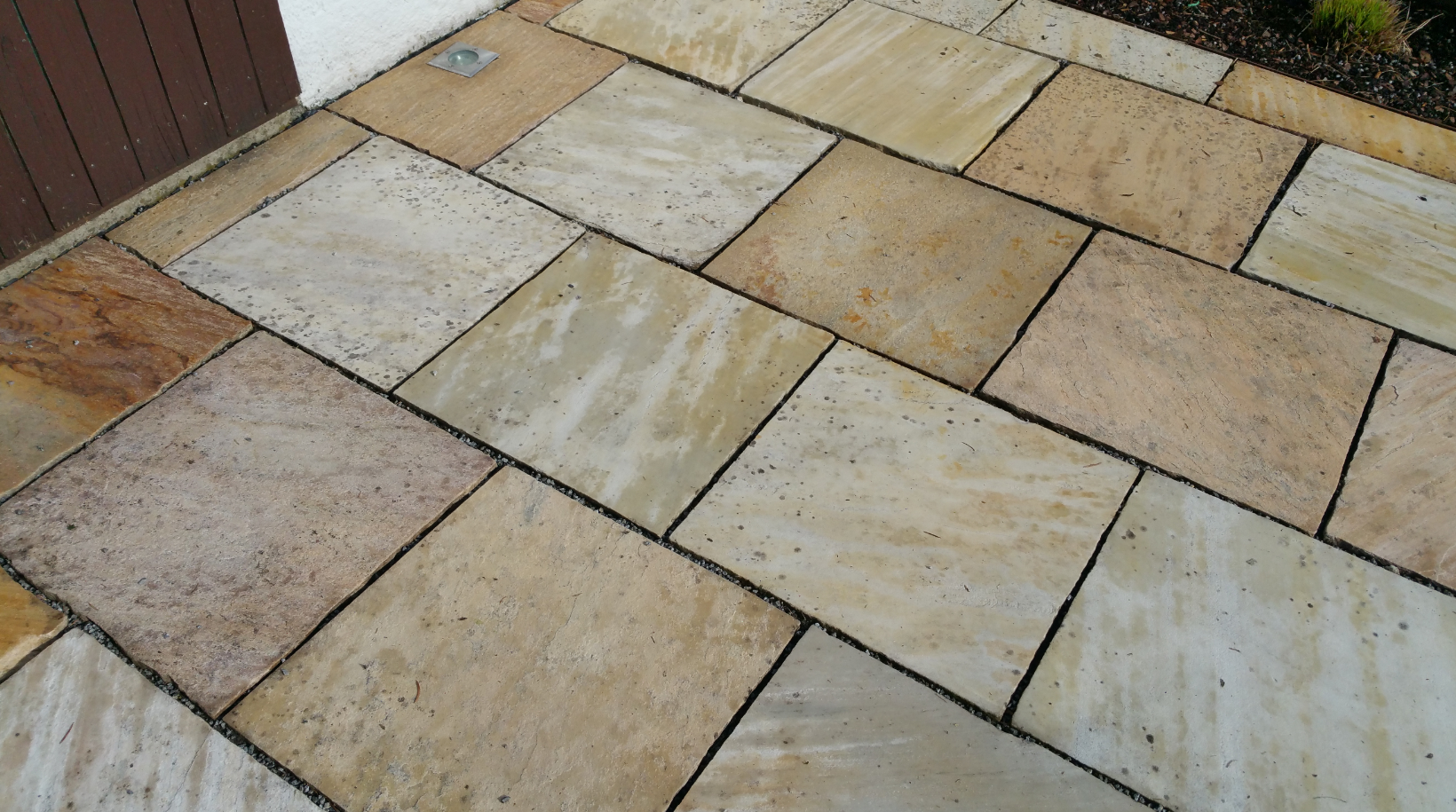 Bei Natursteinen kannst Du nicht einfach so mit irgendwelchen Chemikalien rumprobieren. Außer Algen können es auch Flechten oder Pilze sein. Durch Deine Erstbehandlung hast Du mit Sicherheit die Oberfläche der Platten noch empfindlicher gemacht. Ich würde versuchen, mit einer dünnen Kernseifenlauge und einer Wurzelbürste einer Platte aufs Fell zu gehen. Alles, was „beißt“ oder weiter angreift, solltest Du besser vermeiden.