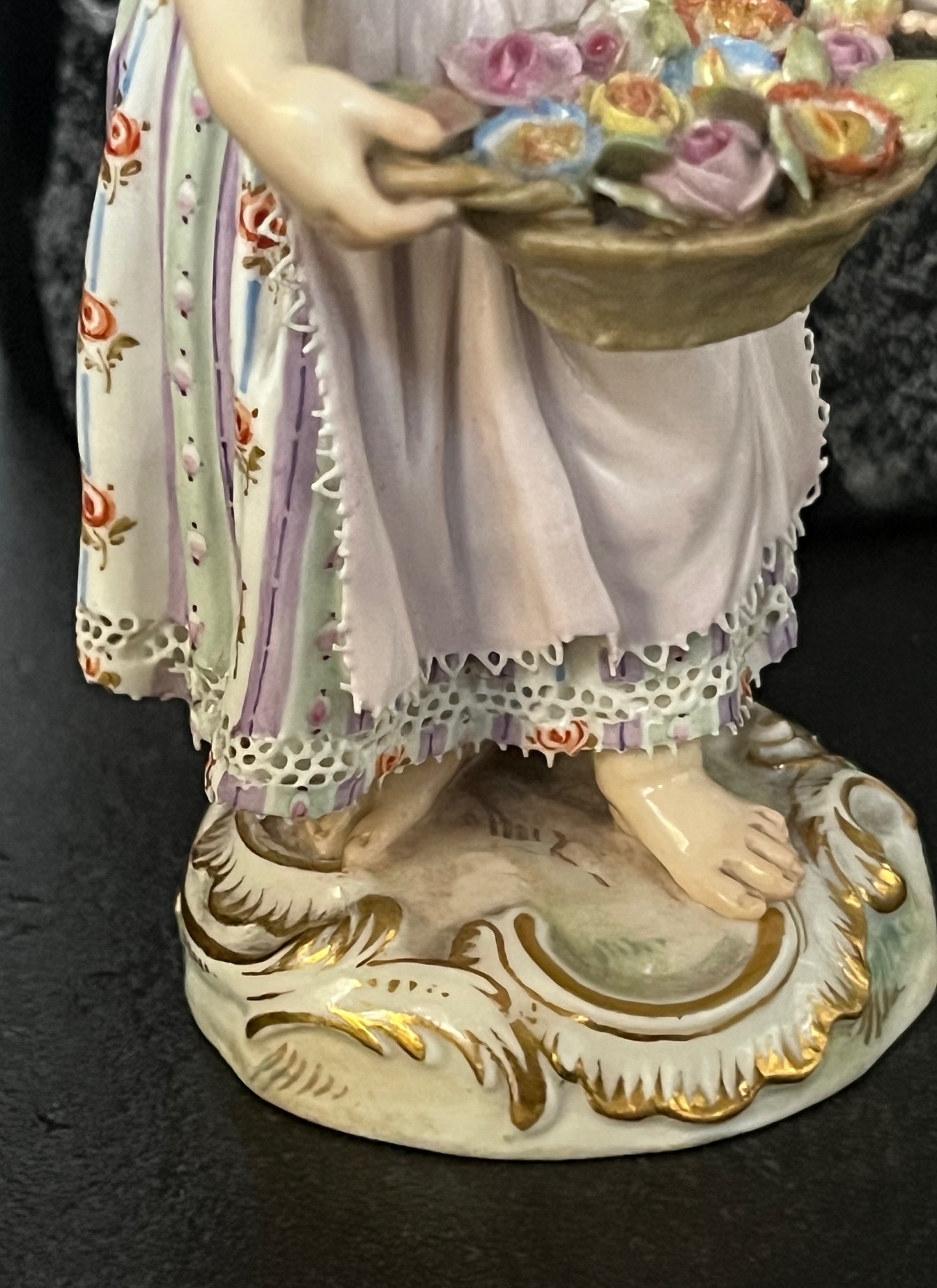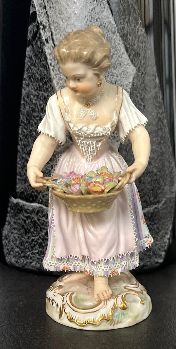aus einen Nachlass steht die hier abgelichtete Figur Meissener Porzellan Gärtnerkind Nr.5 (soweit bekannt). Beim Vergleich mit anderen Figuren mt dieser Bezeichnung ist mir aufgefallen, dass diese hier deultich detailreicher gearbeitet ist, allein der Saum der Kleidung ist hervorzuheben.