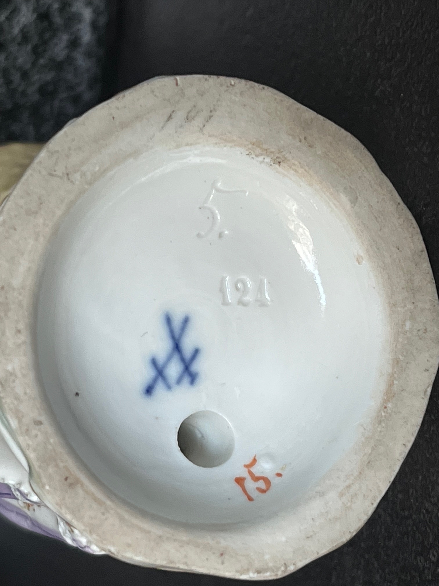 Man müsste jetzt mal sehen, ob Meissen überhaupt mit Porzellanspitze gearbeitet hat. Auf die Schnelle sich mir keine Figuren von Meissen mit Porzellanspitze über den Weg gelaufen, das könnte ein weiteres Indiz gegen Meissen sein. Sitzendorf hat z.B. auch vergleichbare Figuren hergestellt.
