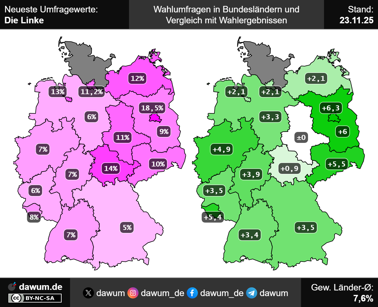 Diese Spaltung macht mir Angst. Sowohl die klare Ost-West-Grenze, als auch die Extrembildung innerhalb eines Landes. In Thüringen steht es gerade 24% AFD zu 25% Linke. Eine Koalition aus CDU, SPD, Grünen und FDP würde gerade so auf 50% kommen. Die SPD fällt als Koalitionspartner der Linken viel zu gering aus, 8% sind ein Witz. Selbst mit zusätzlicher Hilfe durch die Grünen kommt man nur auf 44% der Stimmen.