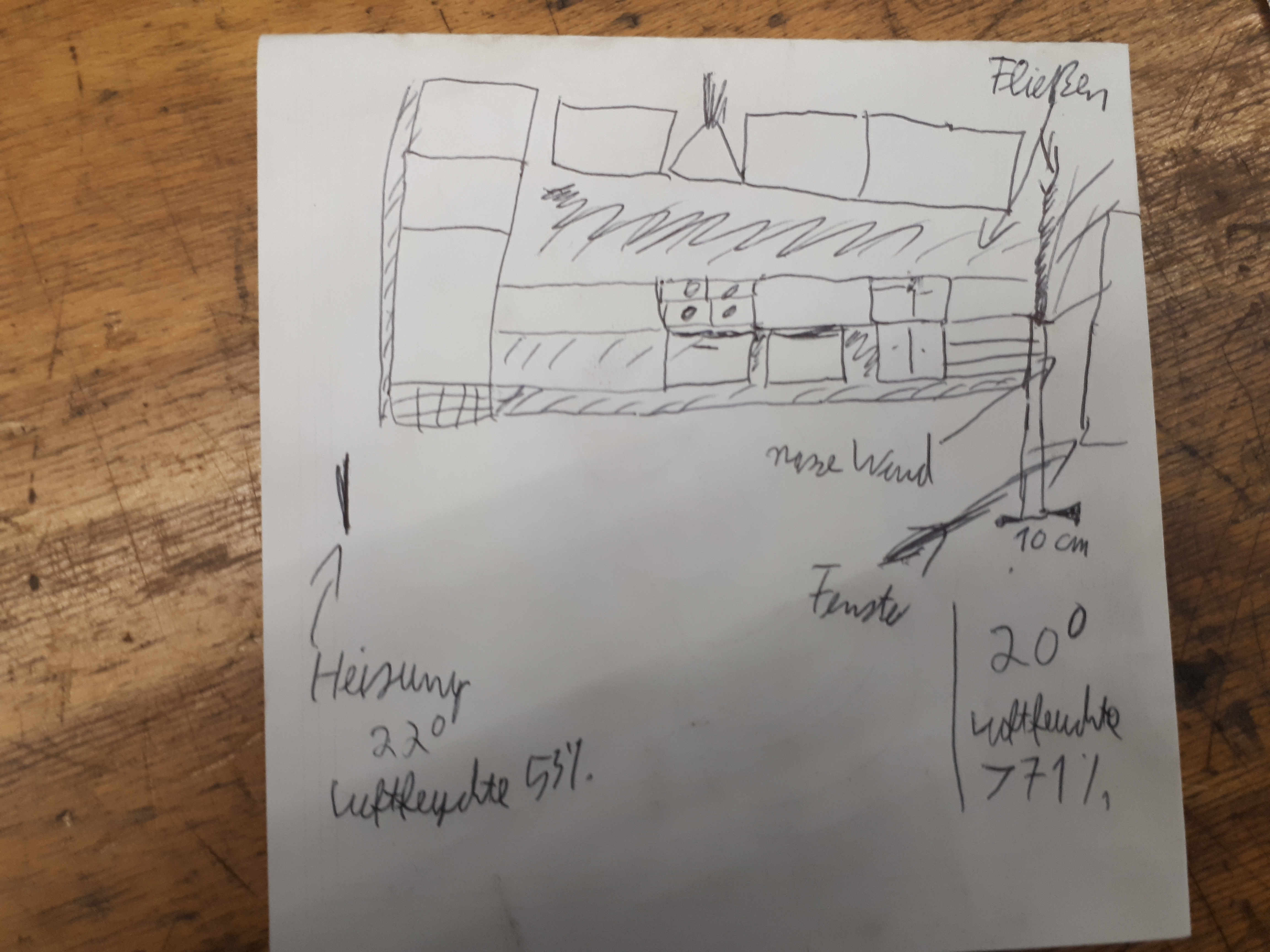 Temperatur liegt bei 20 Grad, Luftfeuchtigkeit an der außenwandseite der Küche 71% (30 min nach lüften) die andere Seite der Küche (3 Meter unterschied) 52 %.