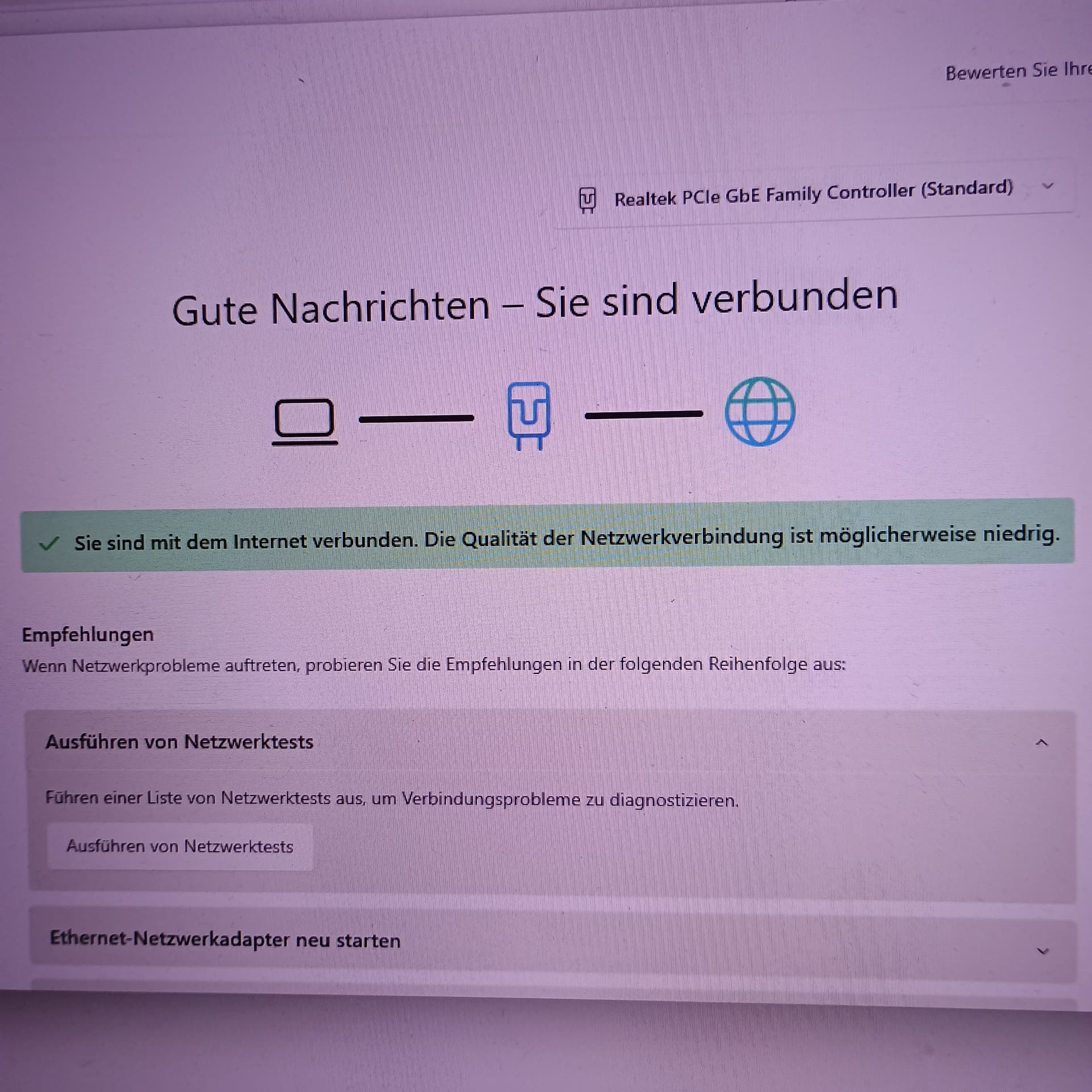 Dann bringen die Bilder sonst leider nicht viel. Bei dem 2. Bild wäre der Unterpunkt Ethernet von interesse. Und wenn Du schon auf der Eingabeaufforderung bist, dann mach dort mal ein ipconfig /all