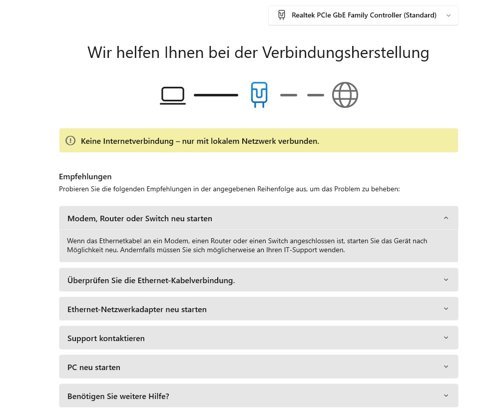 Windows meldet: Mit dem Netzwerk verbunden, mit dem Internet nicht.