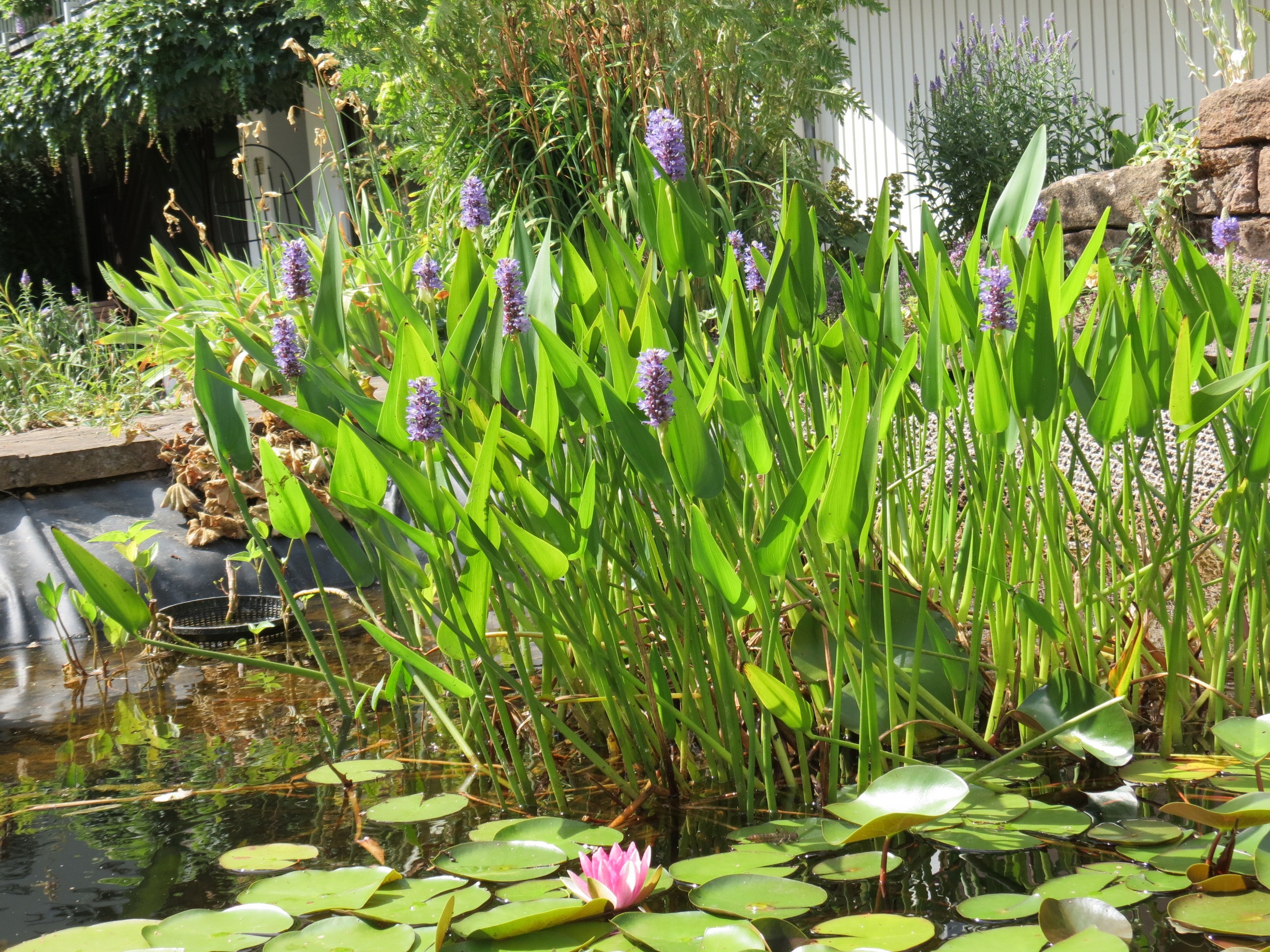 wir haben im Hof einen gemauerten „“„Teich“""" (ca. 3 x 4 m), an der Stelle stand ehedem der Misthaufen. Gefüllt ist der Teichboden mit … tja… irgendwas, worin Pflanzen wurzeln können. Wie tief das Ding ist, wissen wir nicht, nur das er inzwischen undicht ist. Bei Regen füllt er sich, ist aber nach ein, zwei Wochen wieder oberflächlich leer. In einer Ecke steht Rohrkolben, der sich auch bei oberflächlichem Austrocknen einen ganzen Sommer lang ohne Regen wohlfühlen kann. Also steht wohl doch noch Wasser in der Tiefe. Ein Binsenbüschel lebt auch drin, wird aber überwuchert von der gelben Nervensäge, siehe nächster Absatz.