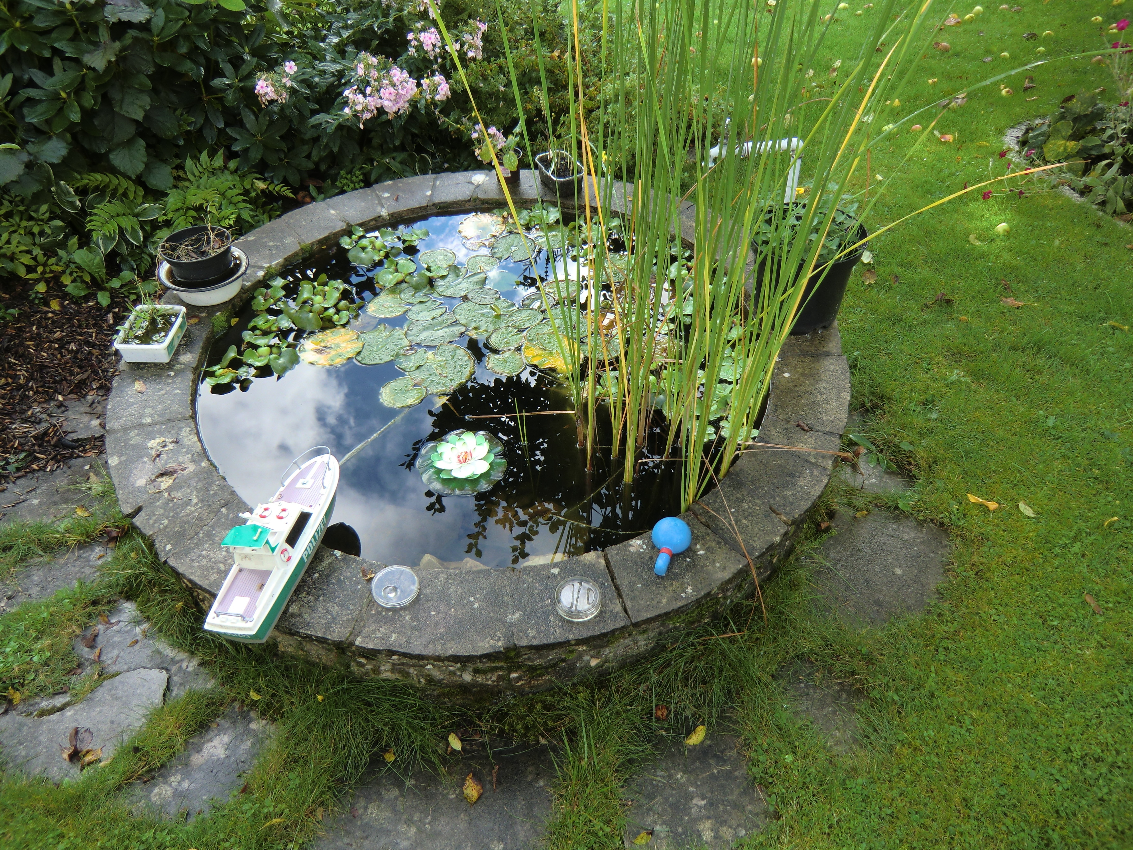 Wie tief wird das Ganze denn schätzungsweise dann werden? Wir haben hier einen kleinen runden Teich übernommen (viel kleiner als Deiner), aber mit Mini-Aufwand ist das ein Schmuckstück… (Mit Wasserkäfern, Frosch, Libelle etc, die Seerosenblüte vorn ist ein Badewannenstöpsel, aber hinten diesind echt :- )) Ich mache nicht mehr als im Spätherbst oder sehr zeitigen Frühjahr mal Laub und anderes Zeug rausschöpfen, weil das Becken unter Bäumen liegt. Von Fischbesatz würde ich abraten - so hast Du eine größere Chance auf klares Wasser.