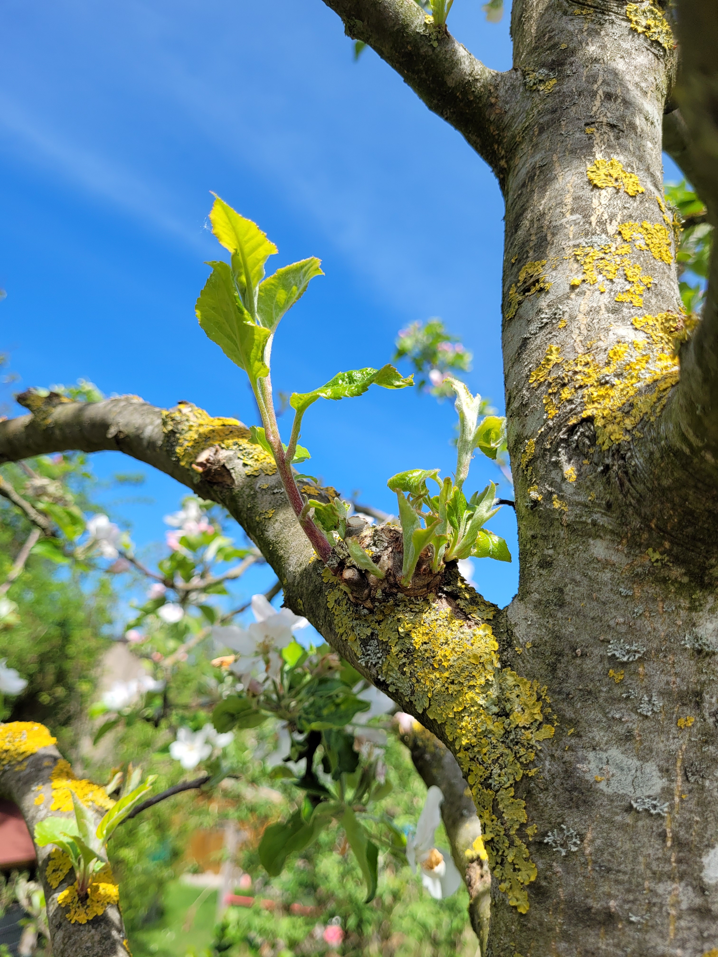 Am Stamm vom Apfelbaum sind die gleichen Ableger.