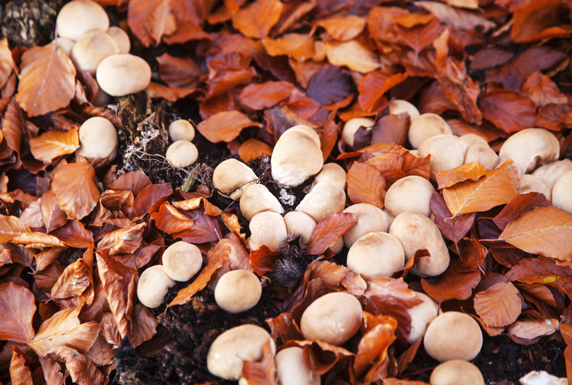 Ich sehe Eierboviste, die auf dem Foto von der Umgebung der Buchenblätter rotbraun getönt erscheinen statt rein weiß. Also ein photographischer Artefakt.