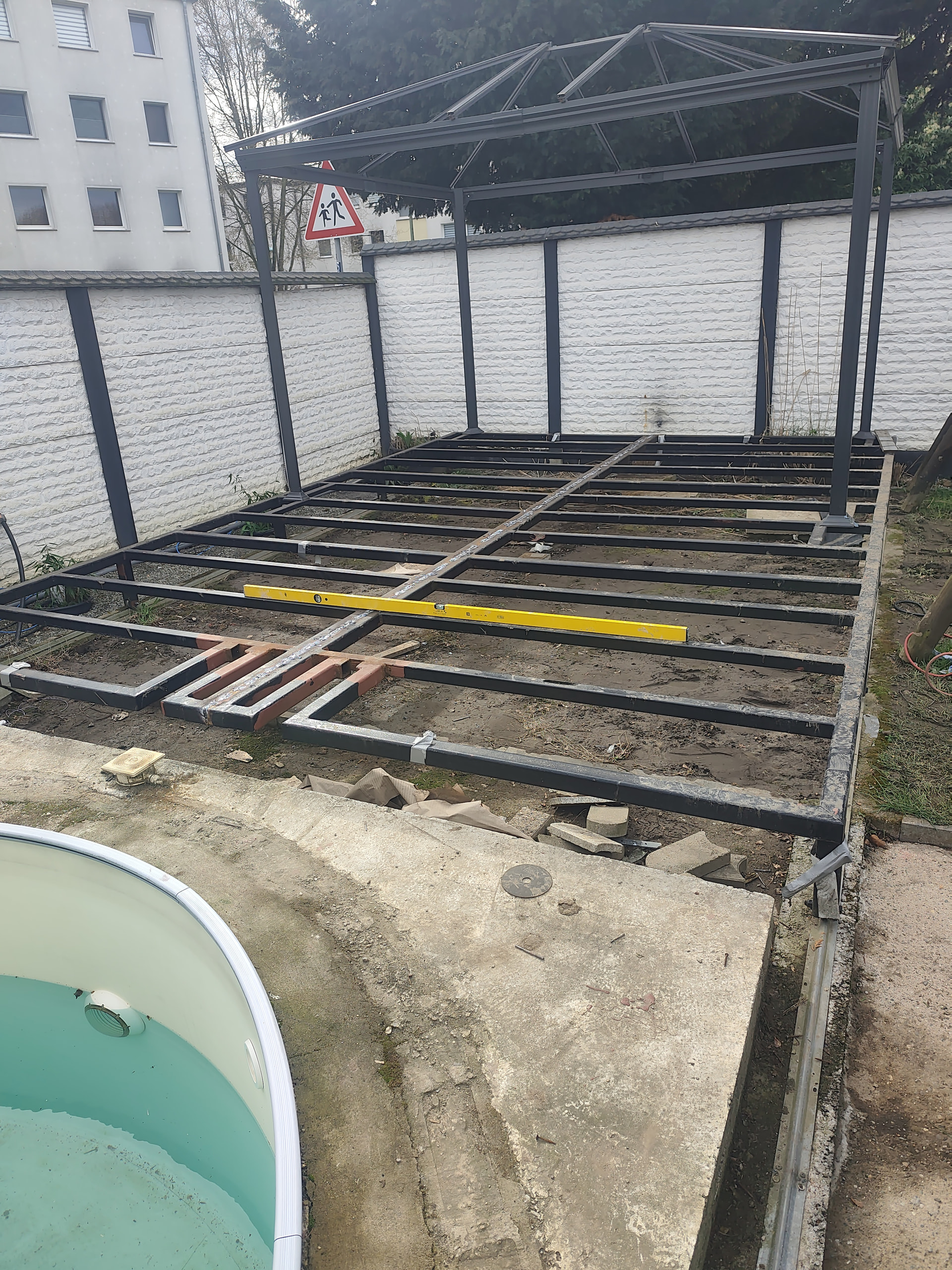 Ich wollte auf die Poolüberdachung Holzdielen befestigen und Gartenmöbel. Aktuell ist die mitte das Problem und ich kenne mich hier zu wenig aus