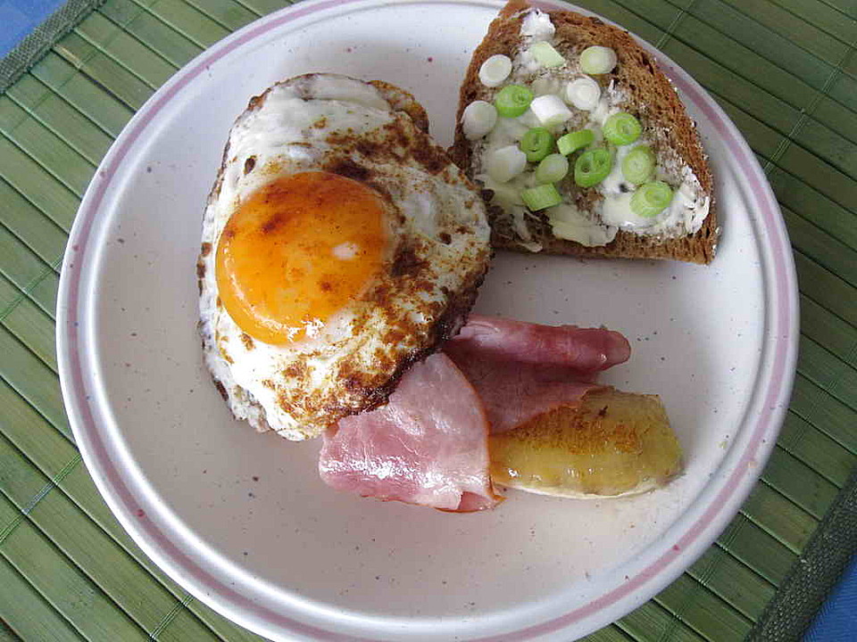 - eingelegte Gürkchen, 1 kleine Zwiebel, 1 kleiner Apfel, ca. 5 cm Porree klein hacken und mit etwas Mayonnaise und Saft von den Gürkchen binden und evtl. abschmecken.