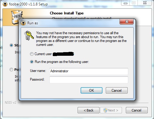 Sie müssen das Administratorkonto aktivieren und ein Passwort dafür festlegen, dann können Sie die runas-Anfrage mit dem Administratorkonto beantworten und die Programme installieren.