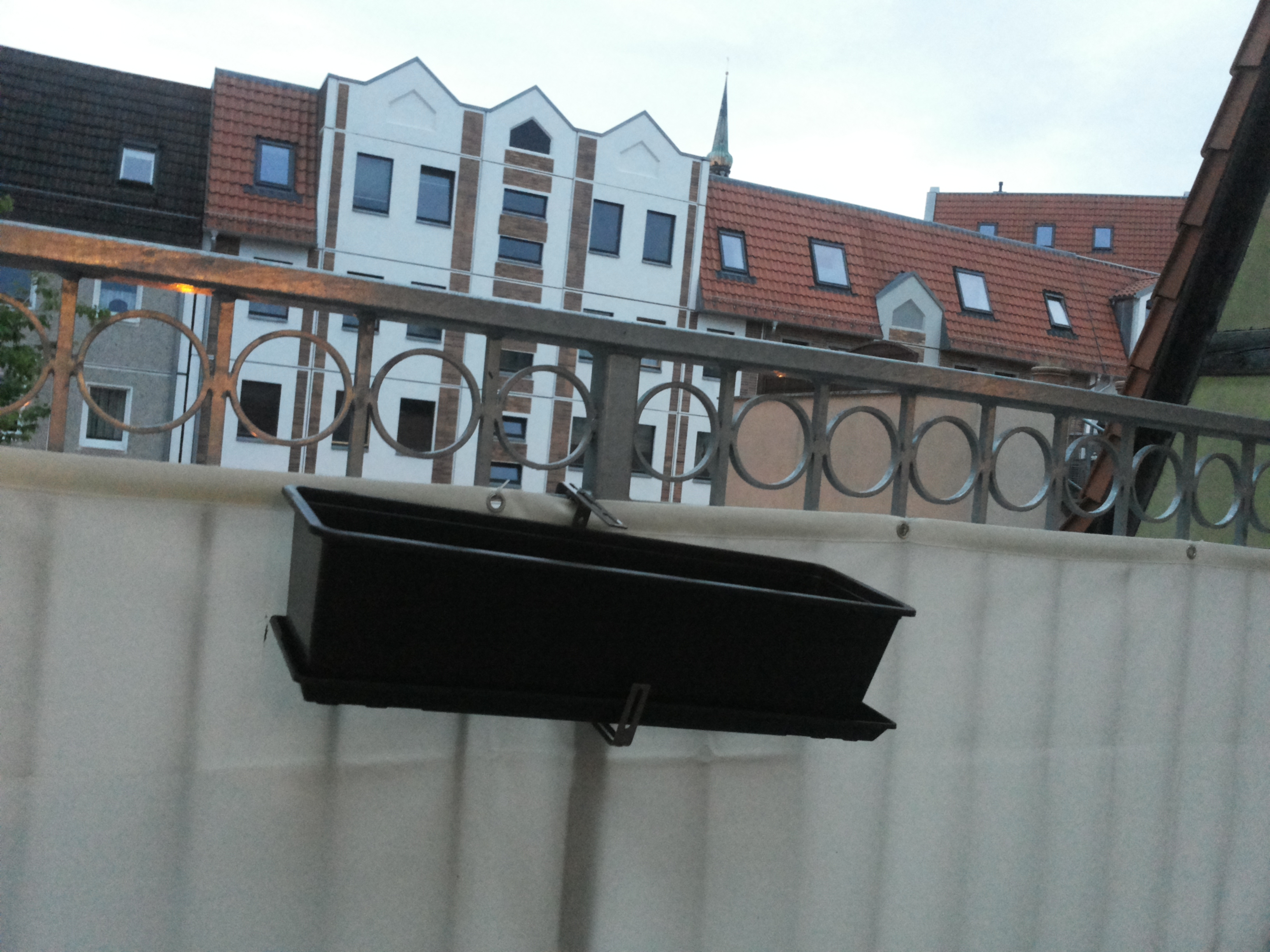 An das - wie ich finde - schöne Balkongeländer hab ich nun in Absprache mit der Vermieterin einen Sichtschutz angebracht (ich konnte sie dazu bringen, dass der nur bis zum oberen Teil des Geländers geht, und den nicht mit einbezieht (sorry, keine Ahnung, wie besser beschreiben