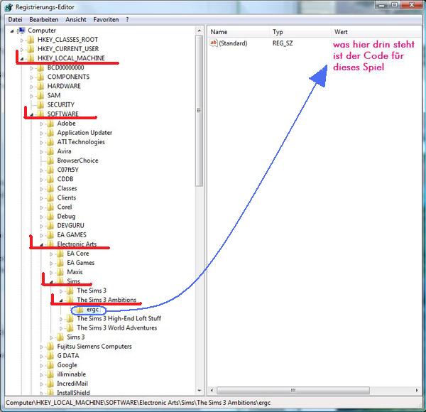 Es ist auch möglich auf dem PC wo die Sims 3 bereits installiert sind den Code in der Registry auszulesen