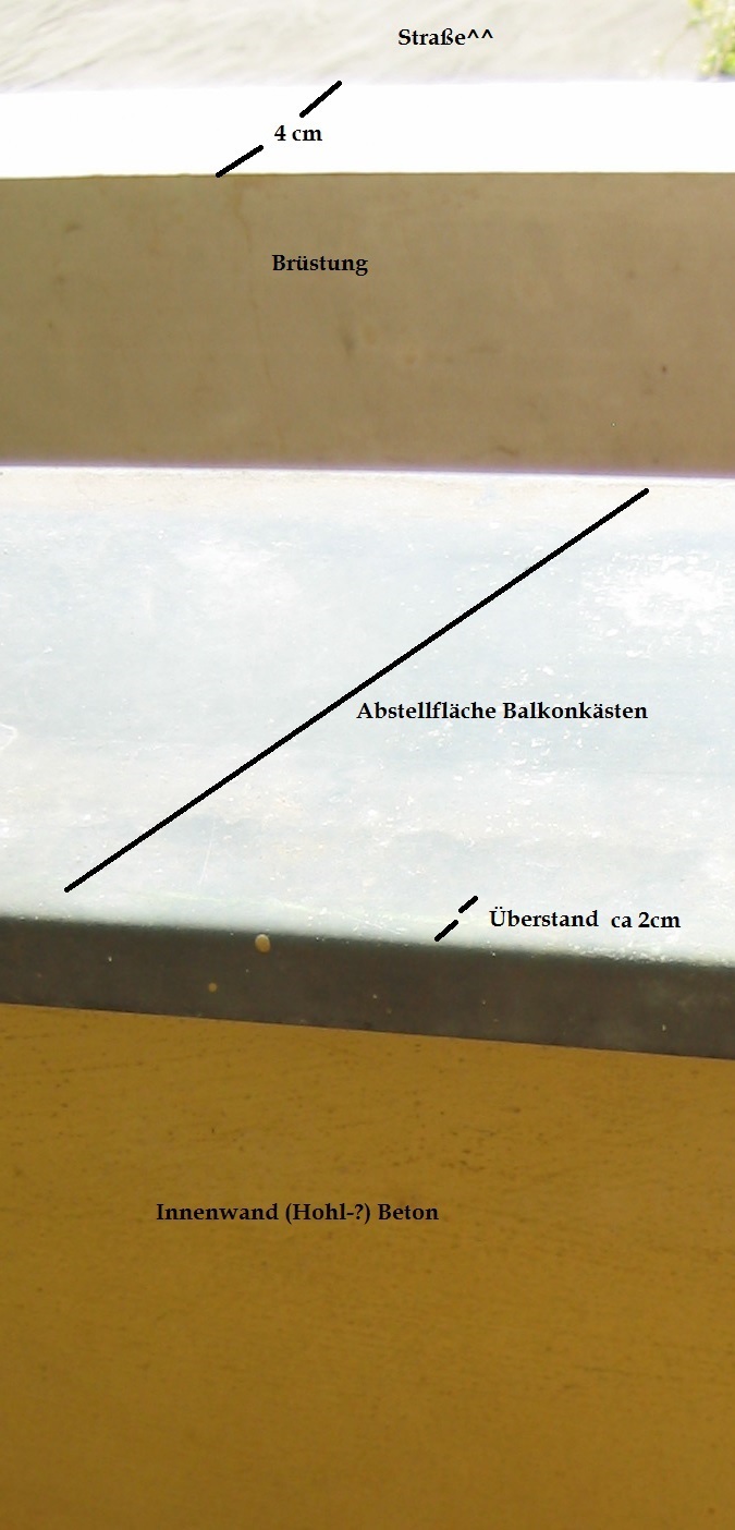 und das mit der Balkonwand gestaltet sich auch als schwierig, weil das „Brett“ (auch aus Metall) wo man die Kästen draufstellen kann, ein gutes Stück nach innen übersteht. Ich bin auch kein guter Handwerker. Am liebsten wäre mir so ein Teil mit Flügelmutter, was ich als dummes Lieschen auch selbst befestigen kann.