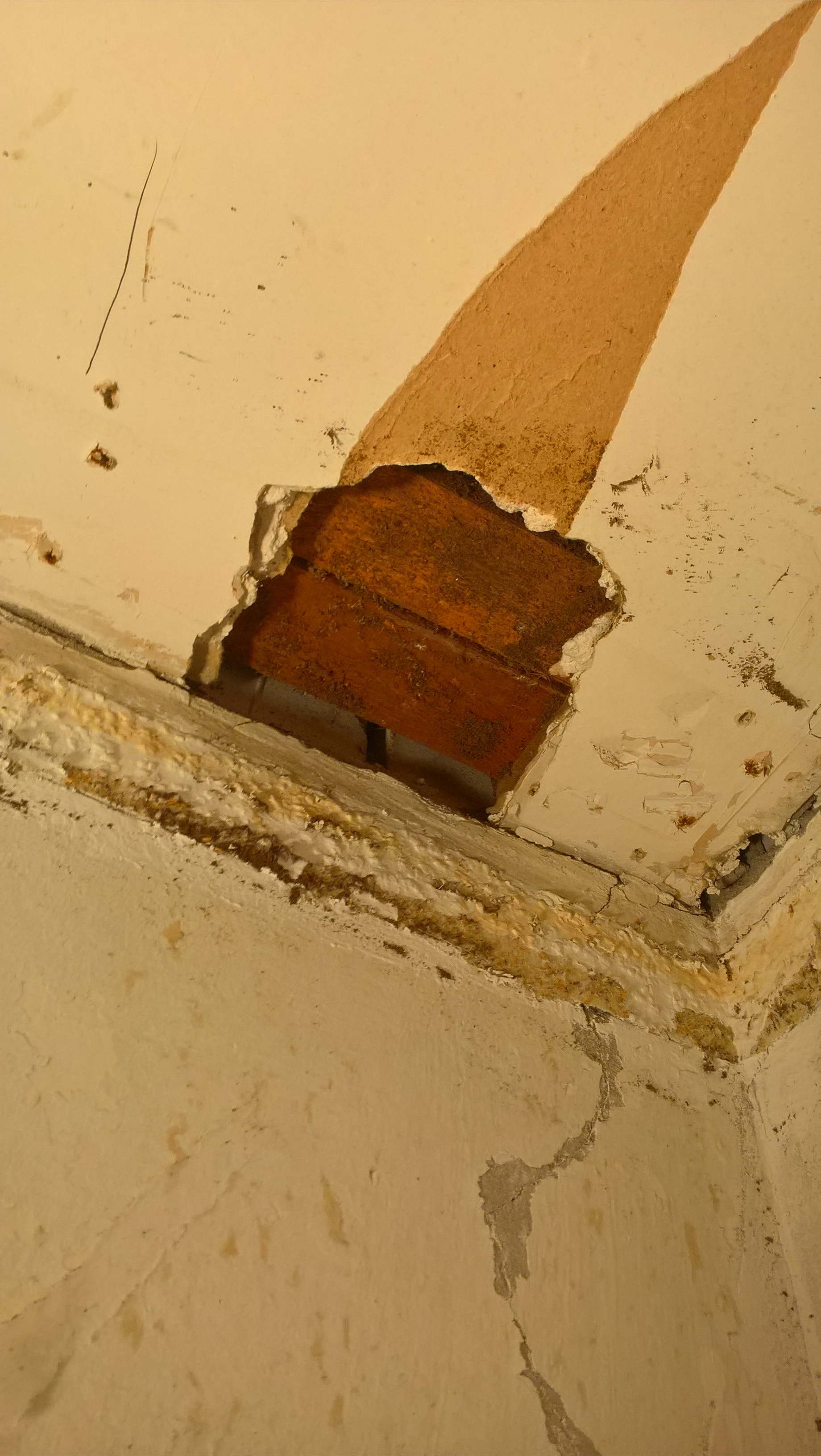 Alternativ durch wiederkehrende Feuchtigkeit in der kühlen Jahreszeit und hohe Temperatur im Sommer zersetzte Spanplatte, was über die Jahre dann herunterfiel.