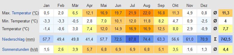 Die Höhe ist bei etwa 500m. Hier noch eine Zusammenfassung aus Wikipedia zum Wetter der letzten knapp 25 Jahren.